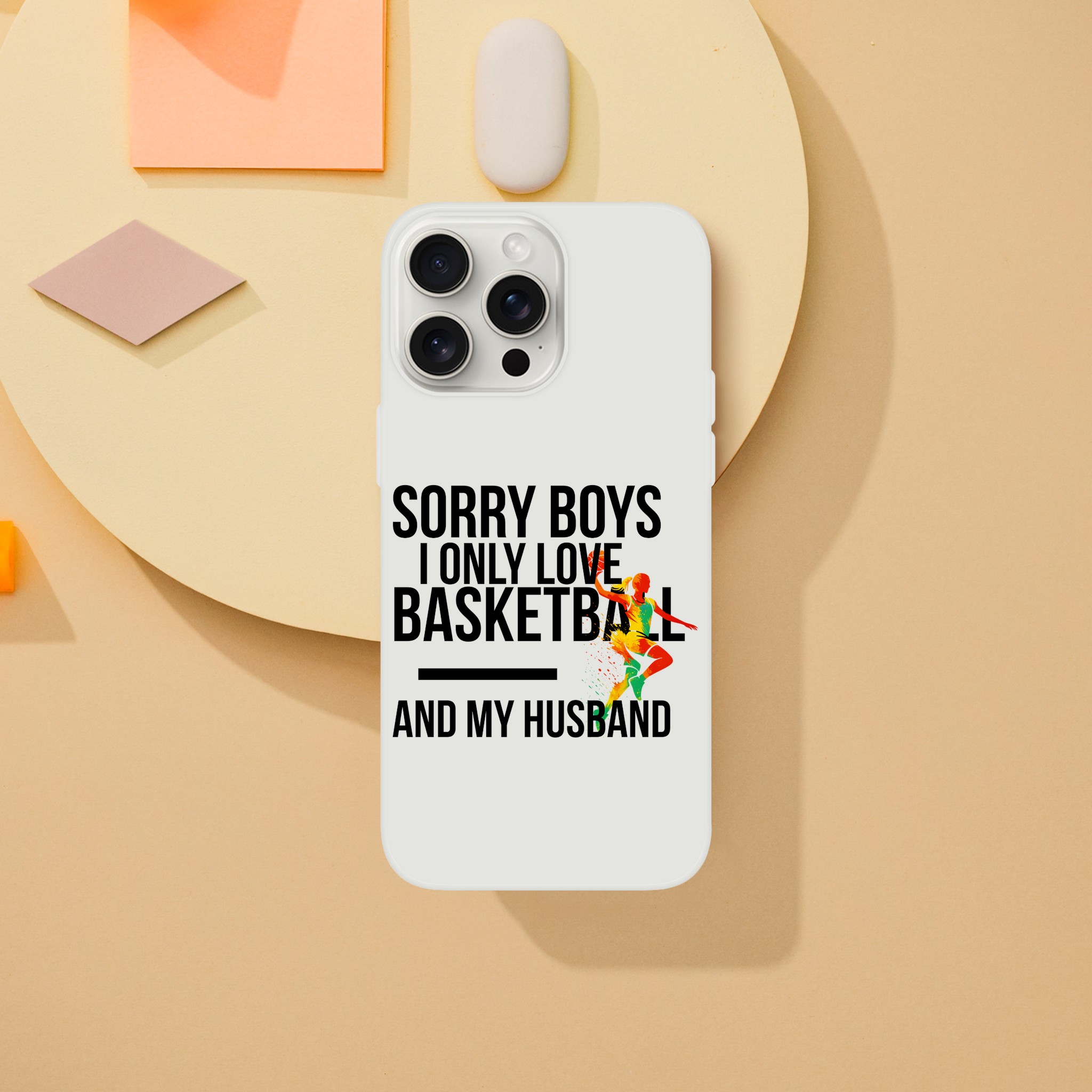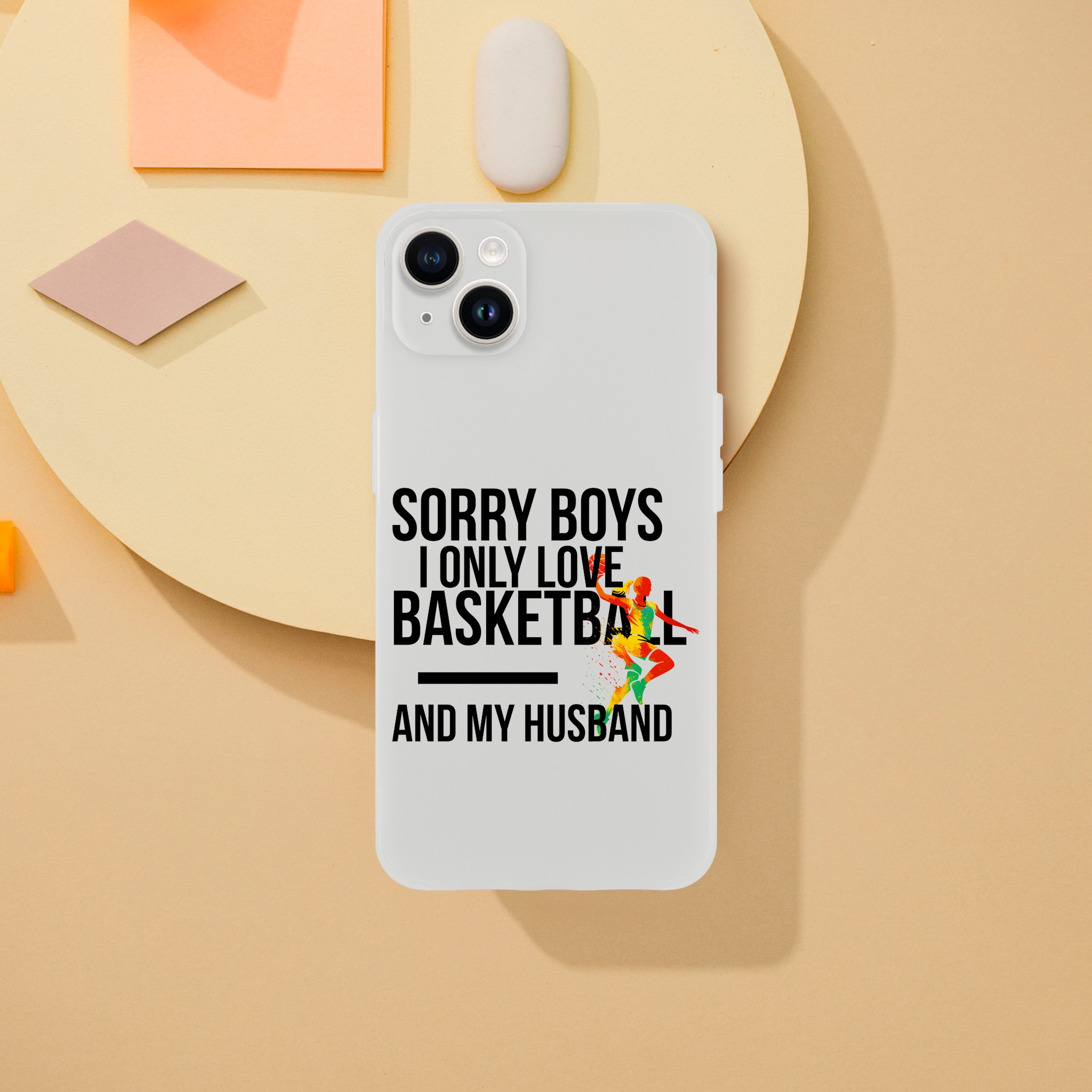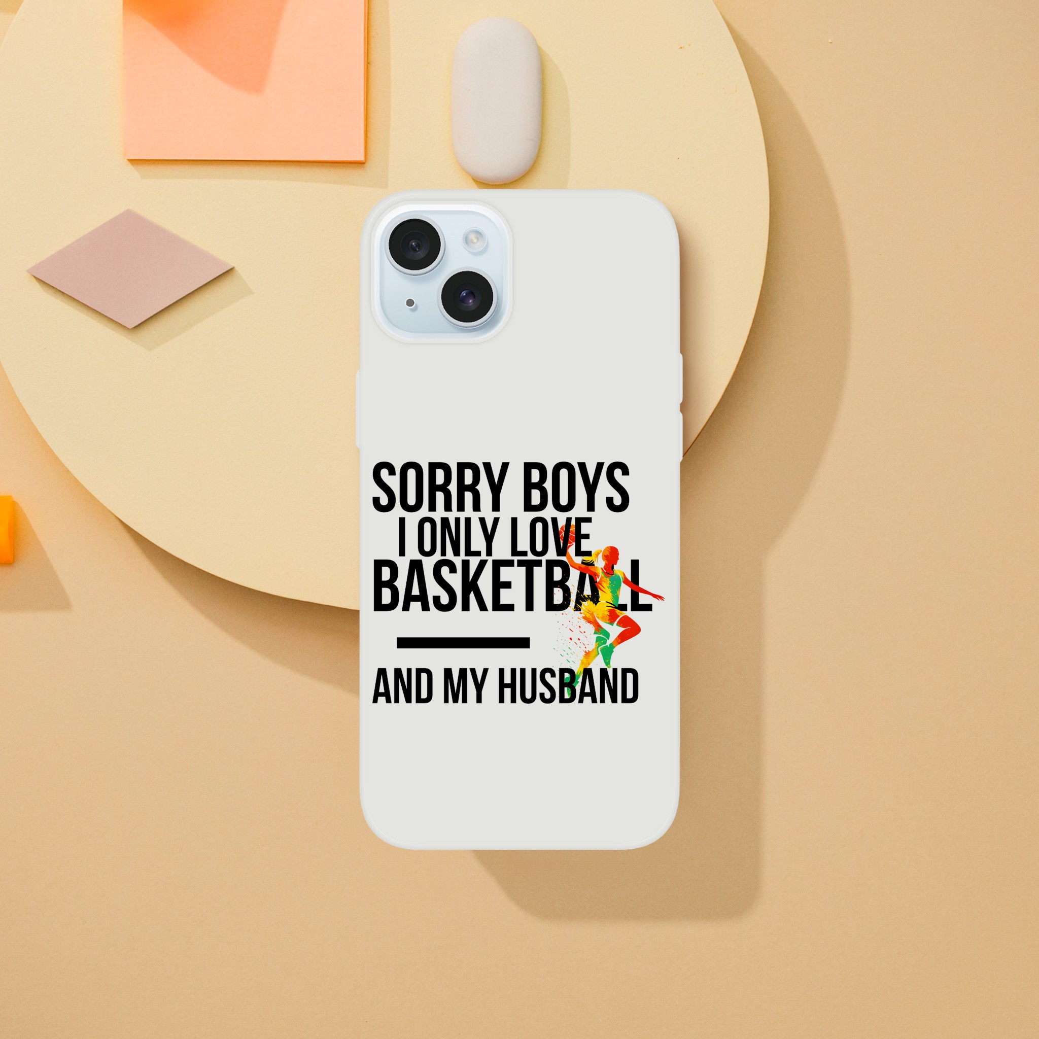Coque Flexi compatible iPhone « Sorry Boys I Only Love Basketball And My Husband« . Transparente givrée, flexible et résistante.