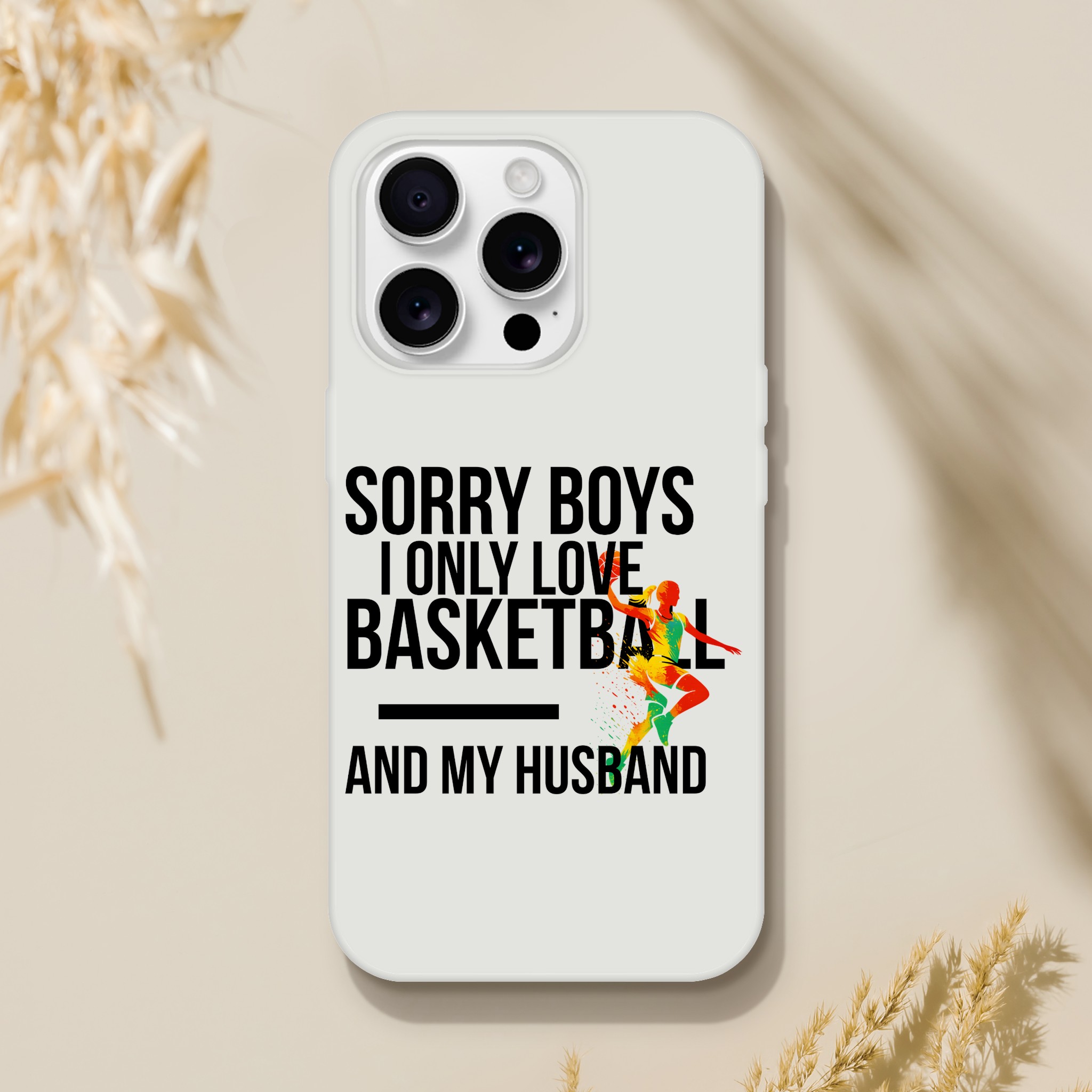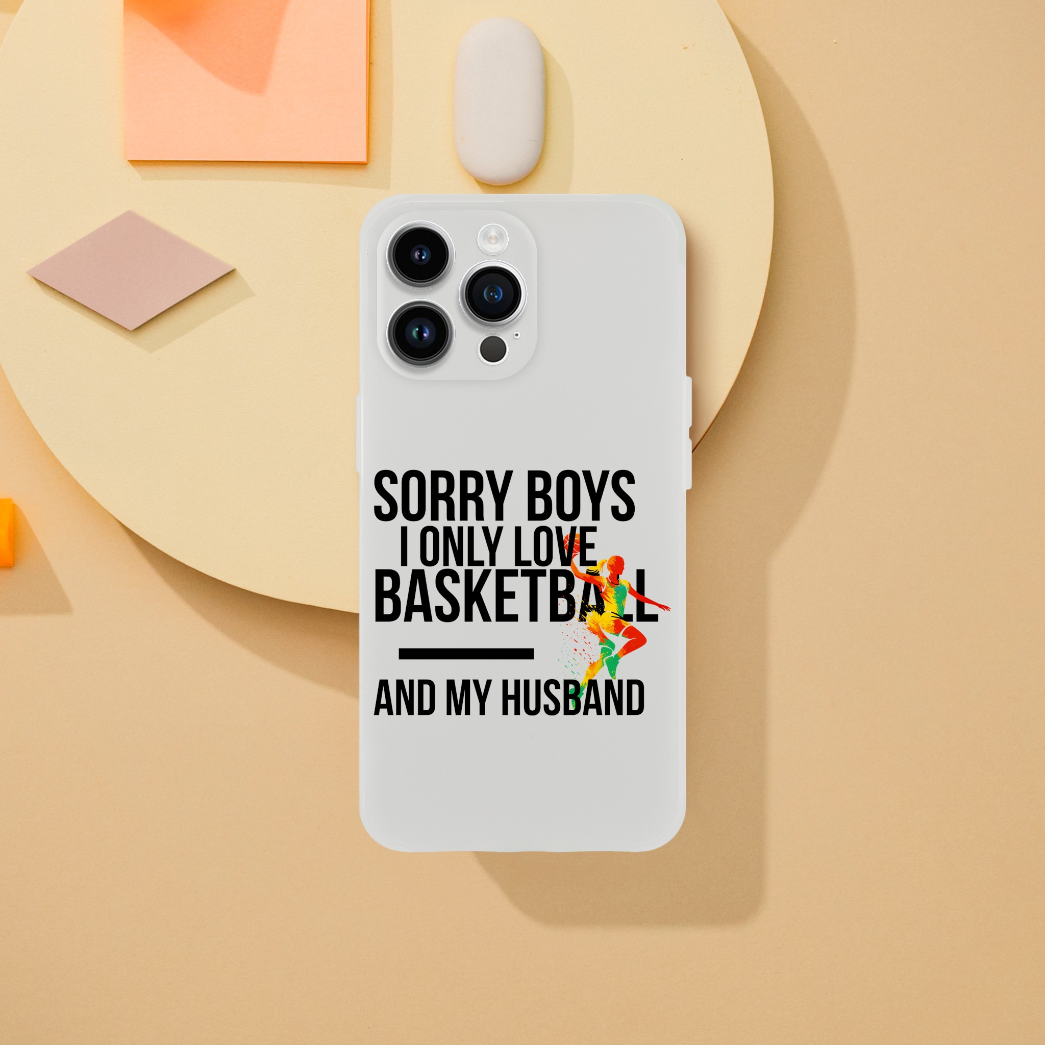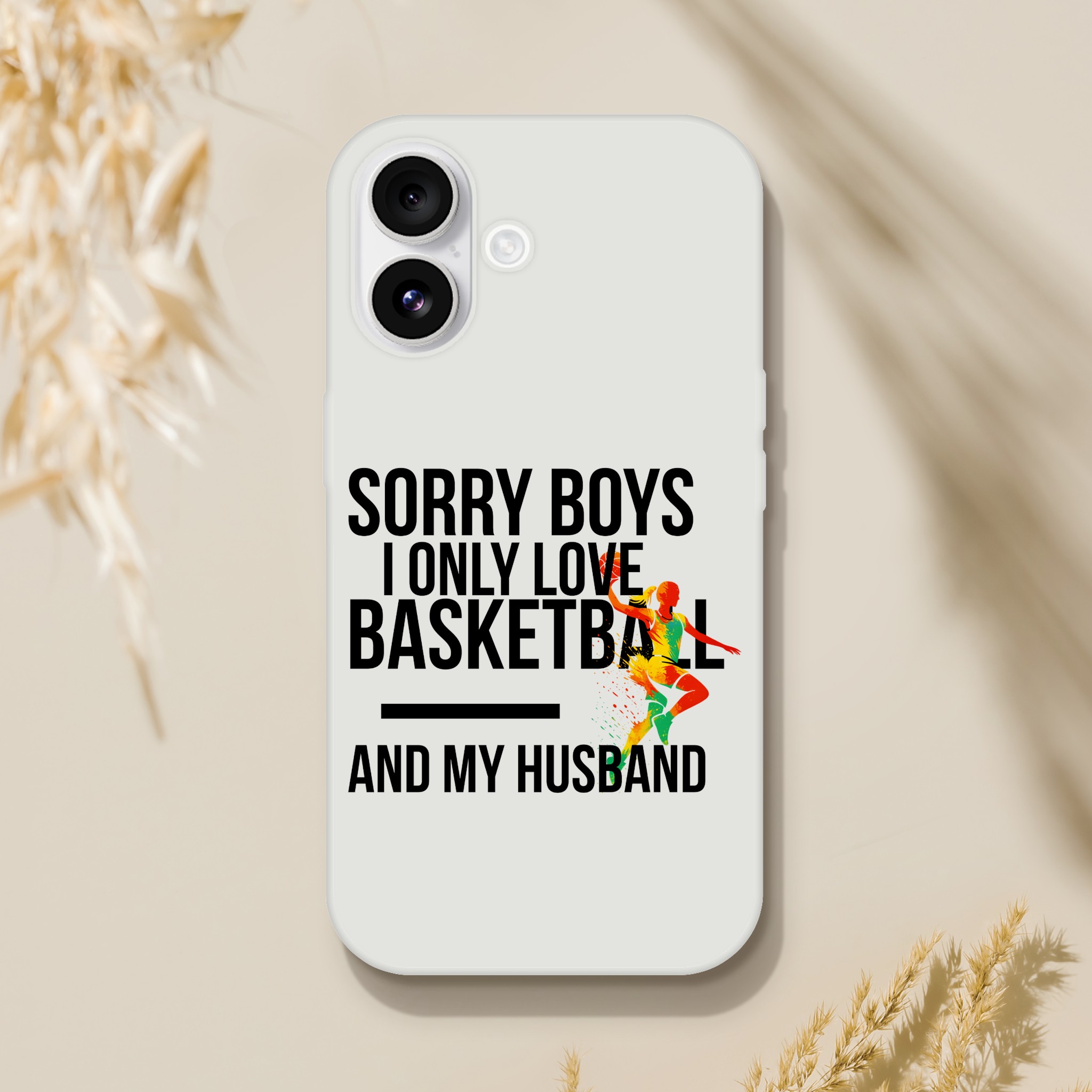 Coque Flexi compatible iPhone « Sorry Boys I Only Love Basketball And My Husband« . Transparente givrée, flexible et résistante.