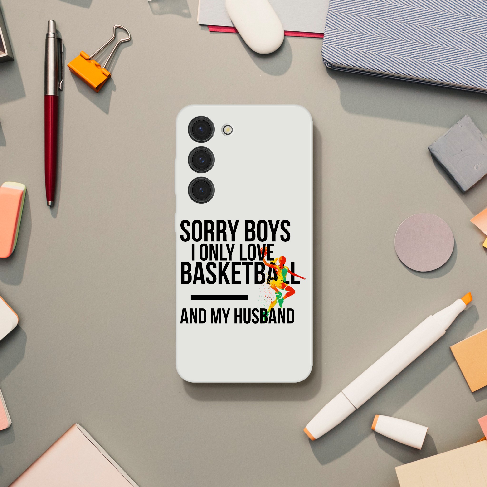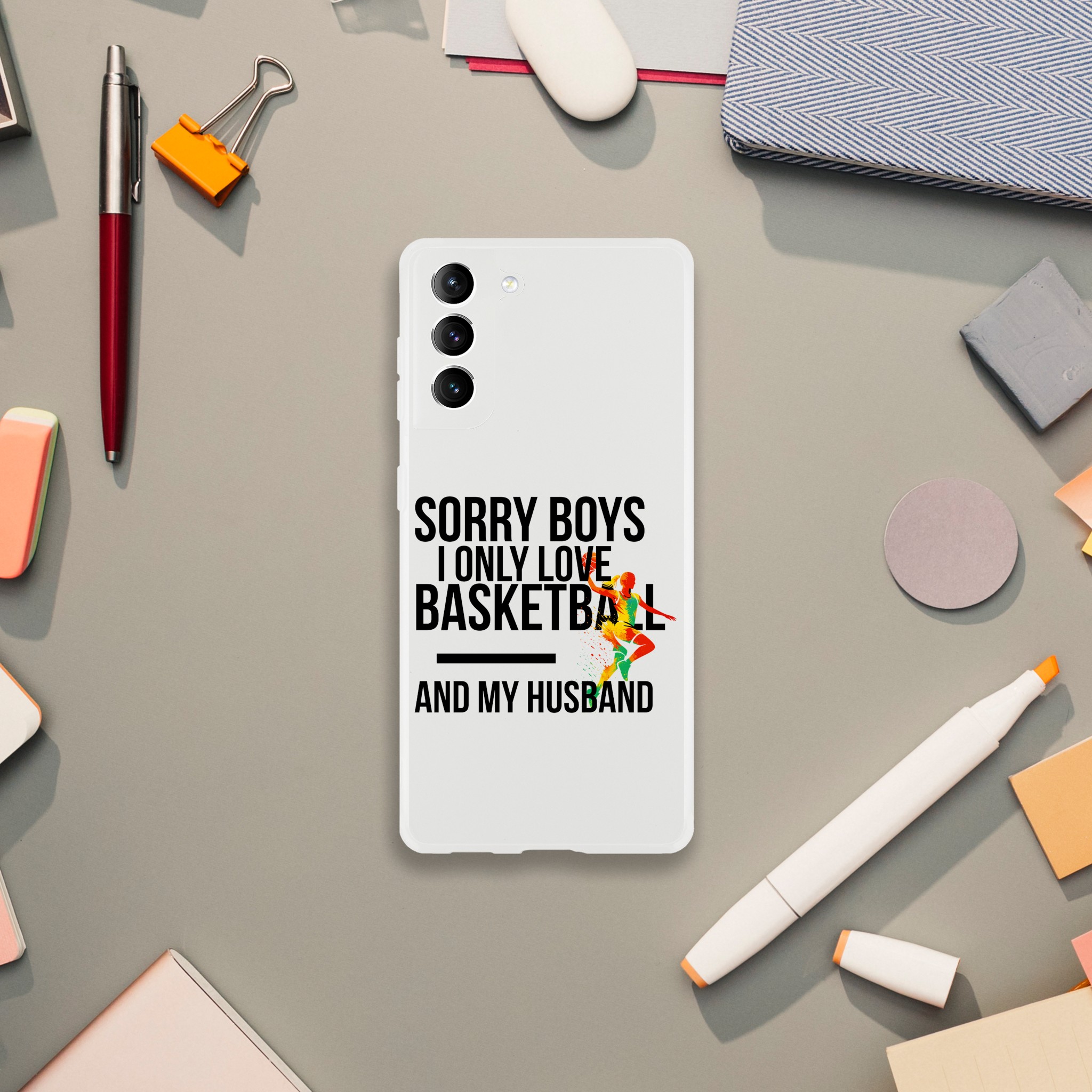 Coque Flexi compatible Samsung « Sorry Boys I Only Love Basketball And My Husband« . Transparente givrée, flexible et résistante.
