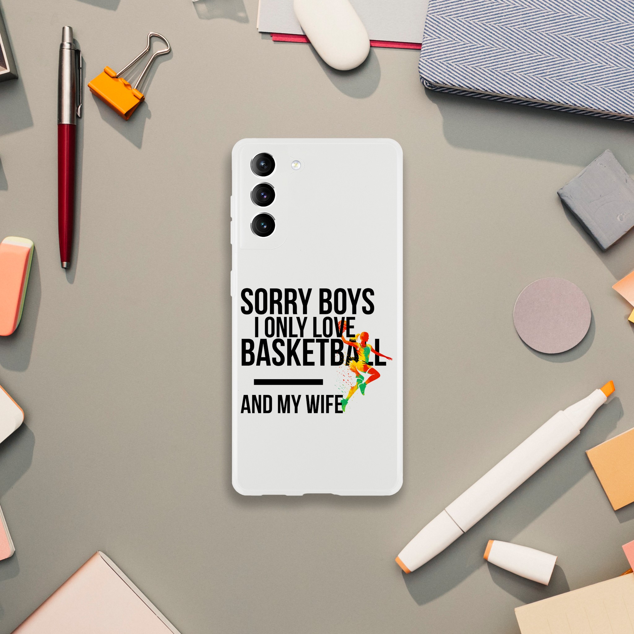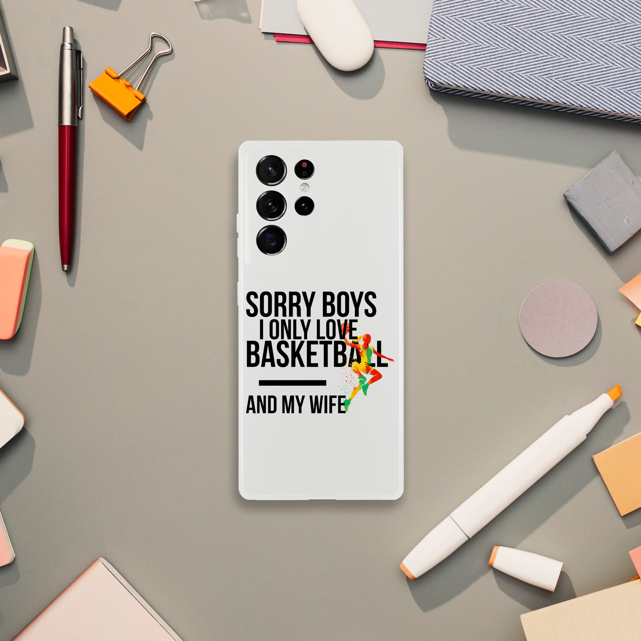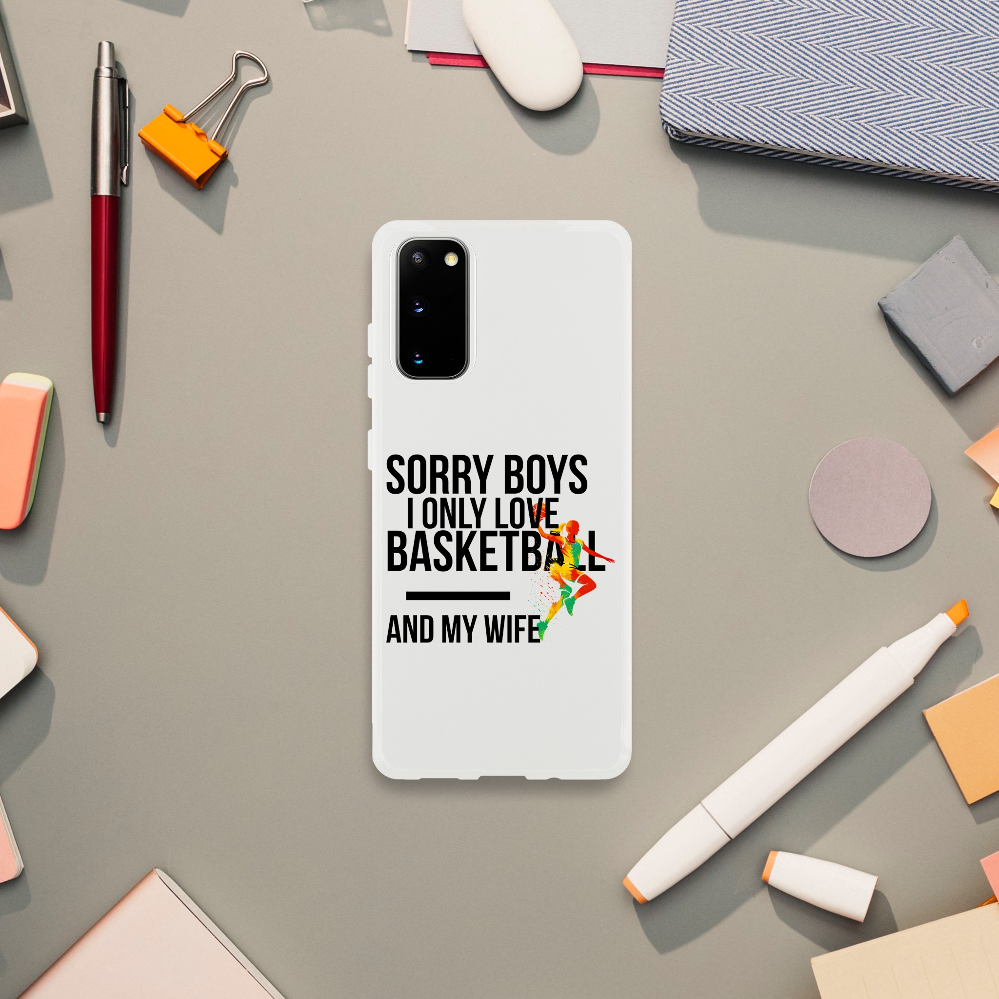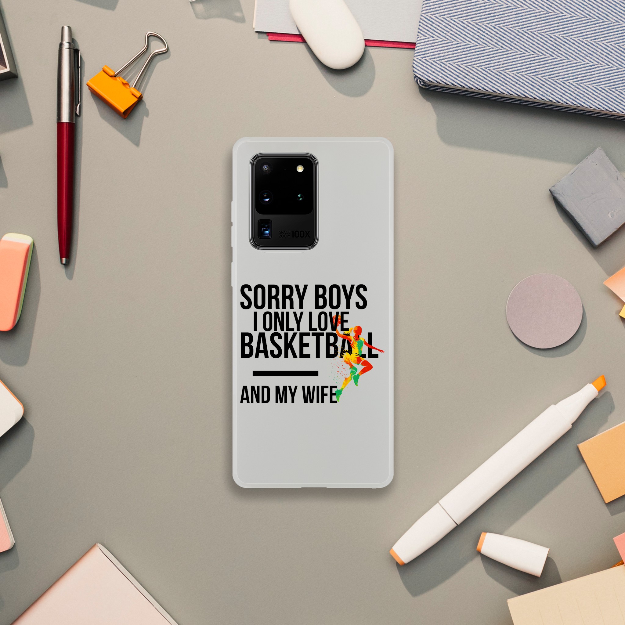 Coque Flexi compatible Samsung « Sorry Boys I Only Love Basketball And My Wife« . Transparente givrée, flexible et résistante.