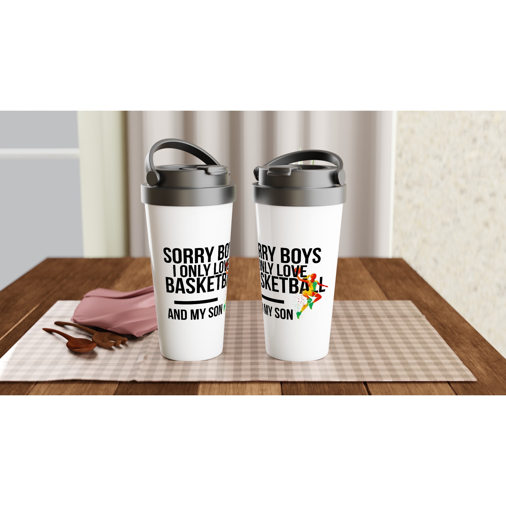 Mug de voyage sport personnalisé « Sorry Boys I Only Love Basketball And My Son« . Acier inoxydable 443ml (15oz), étanche, maintient la température des heures. Compatible lave-vaisselle.