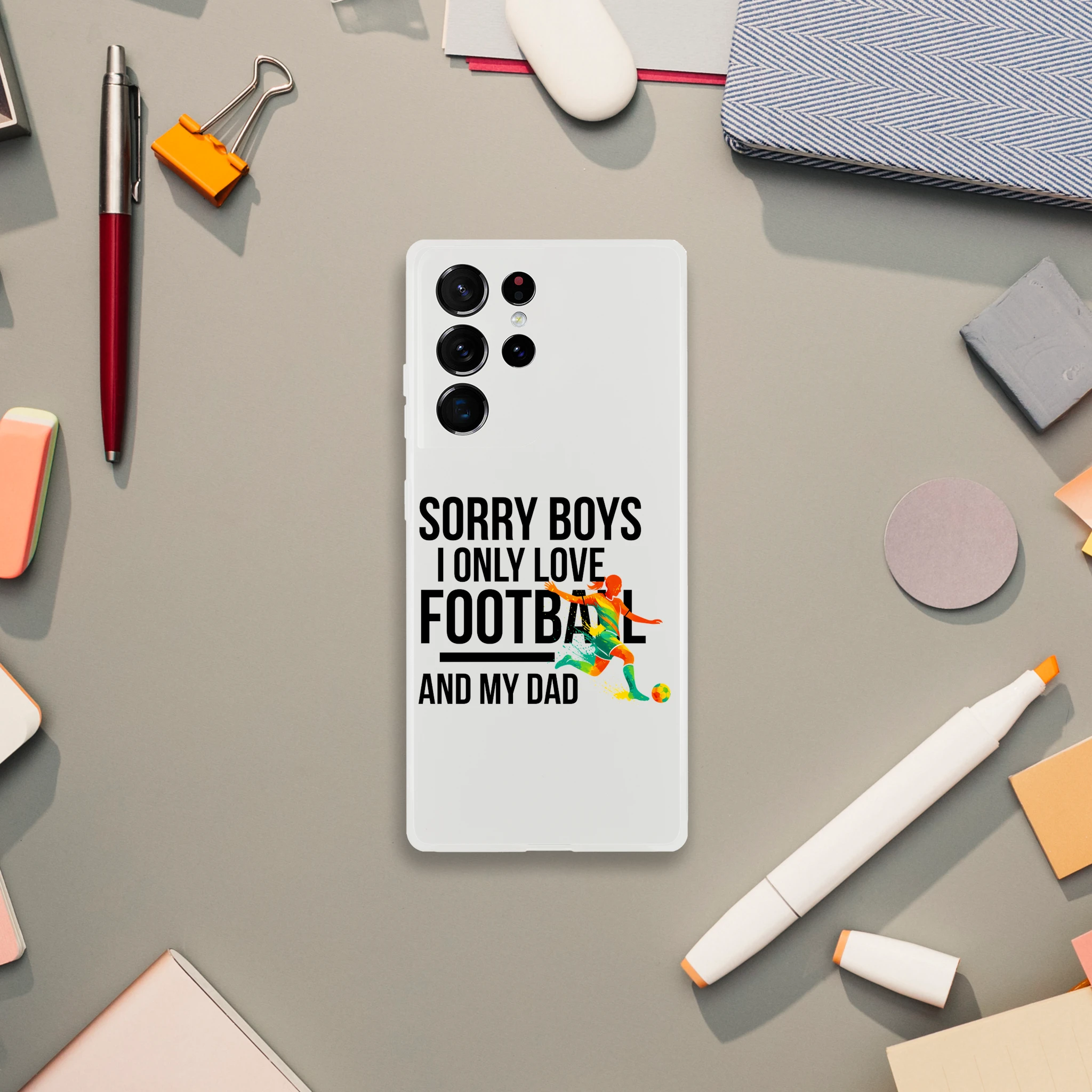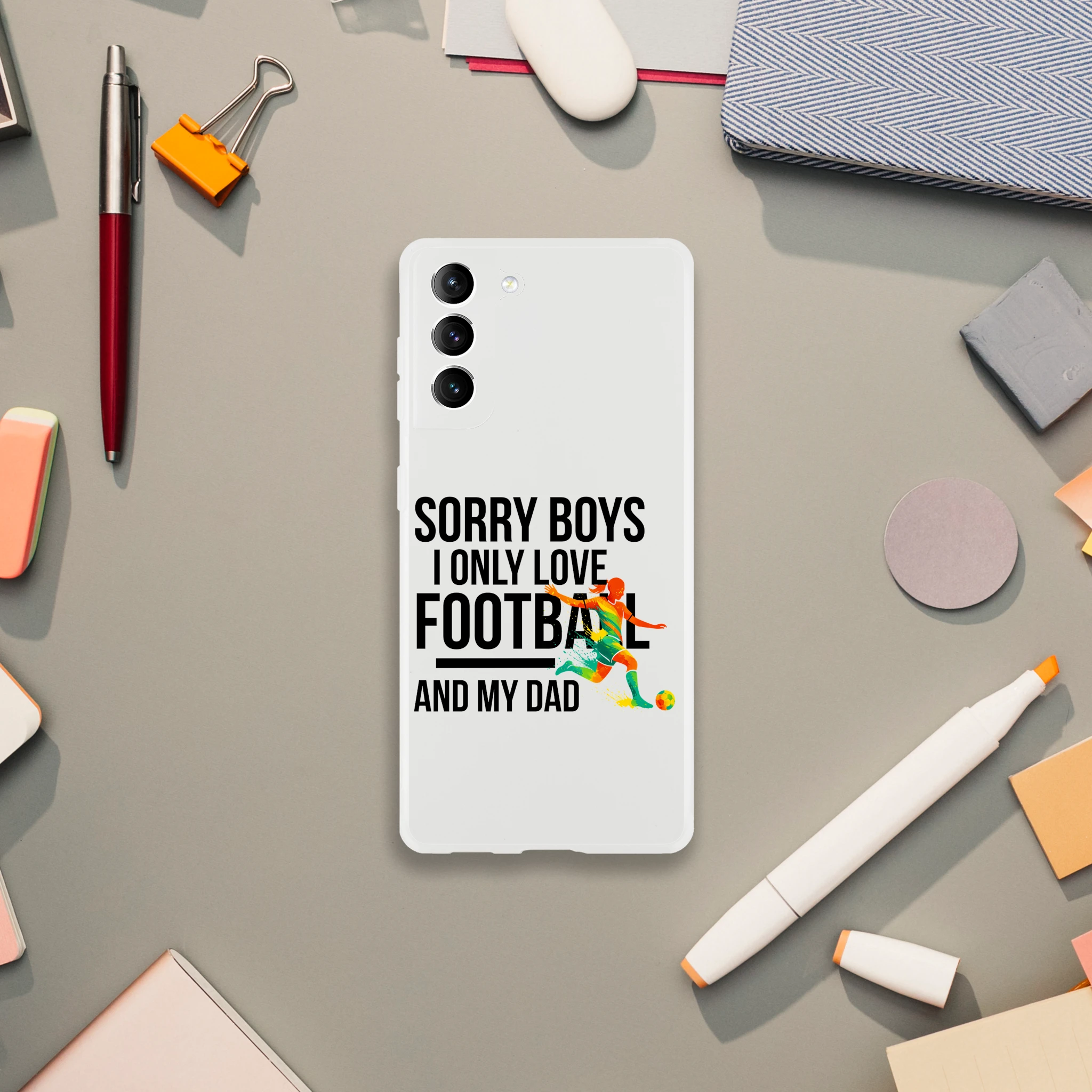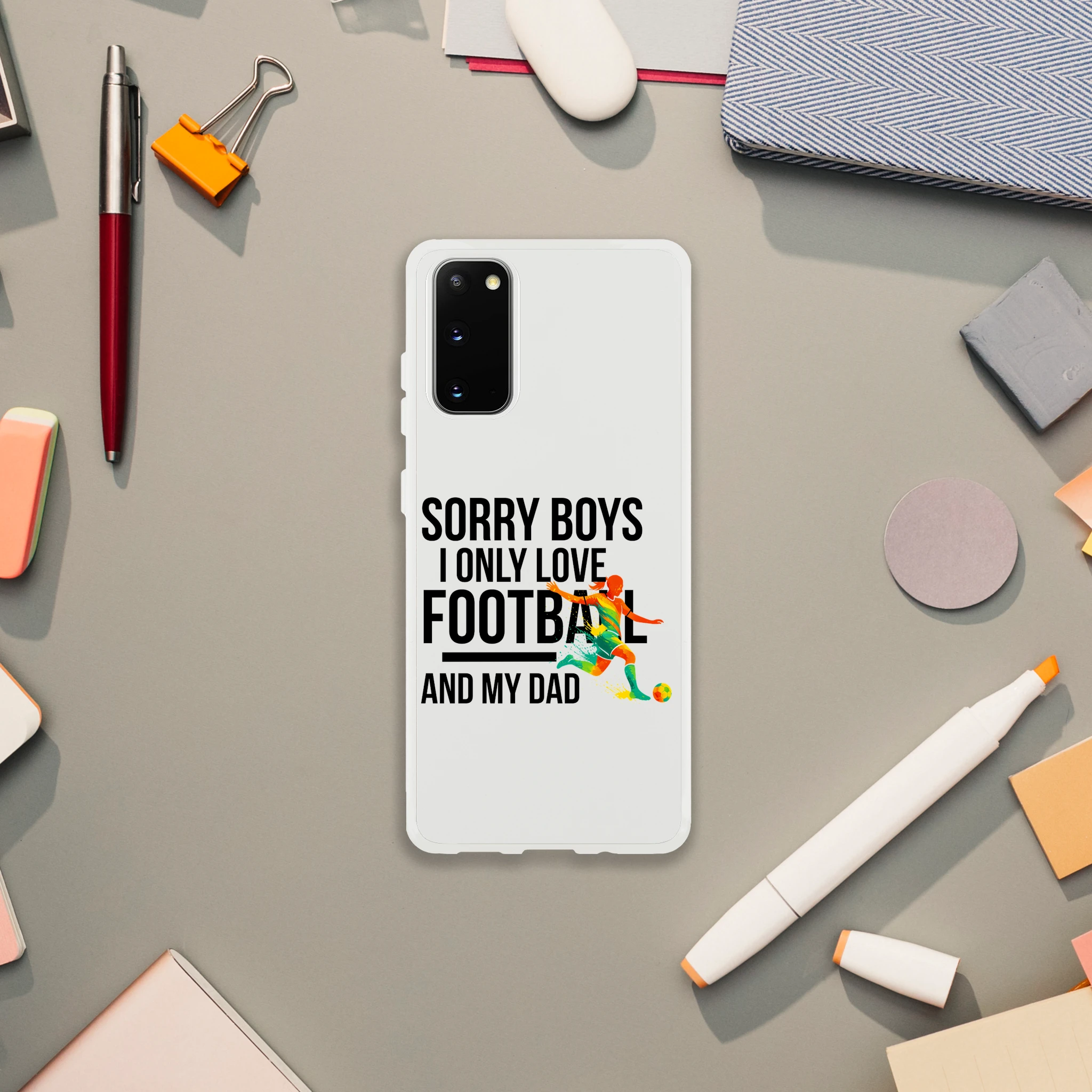 Coque Flexi compatible Samsung « Sorry Boys I Only Love Football And My Dad« . Transparente givrée, flexible et résistante.
