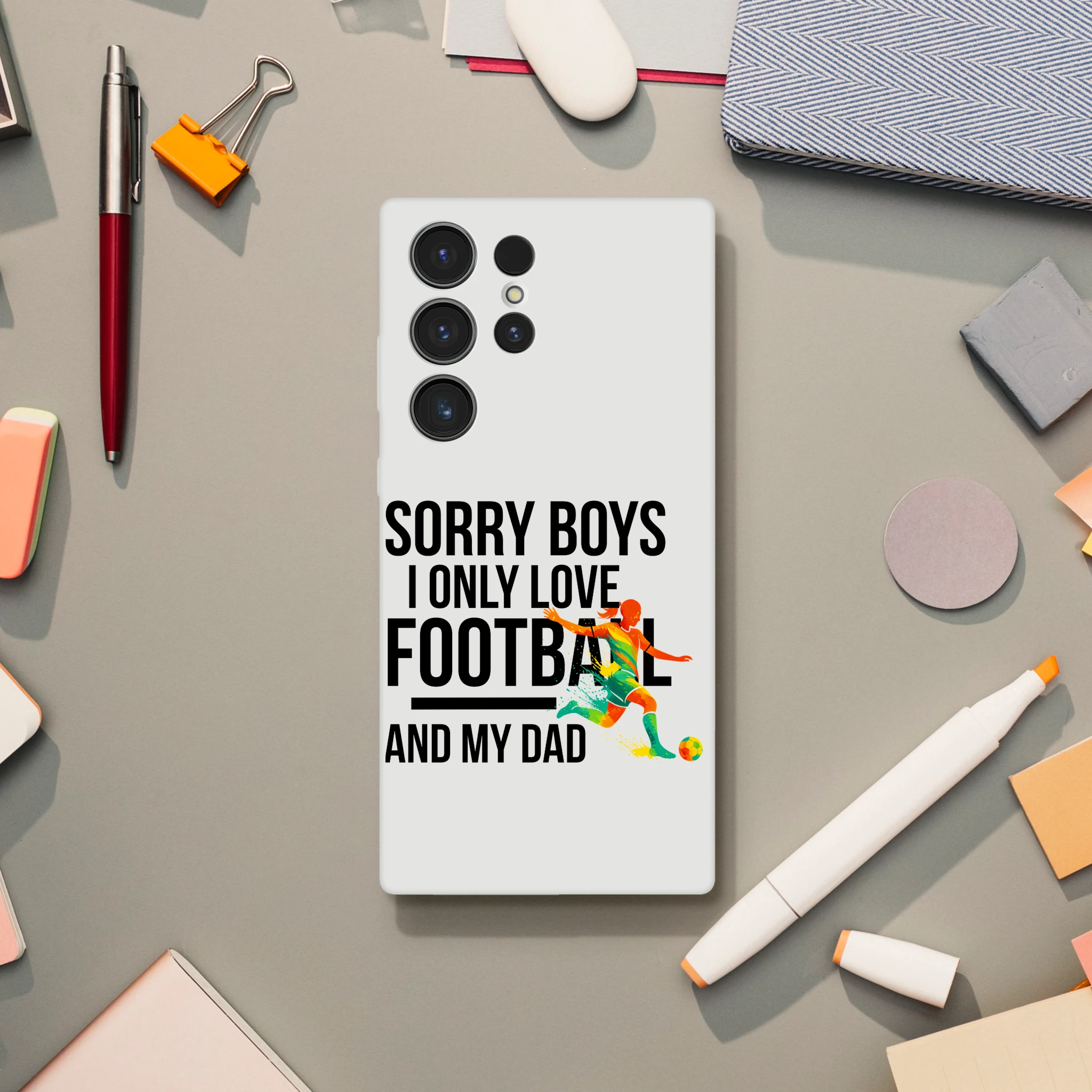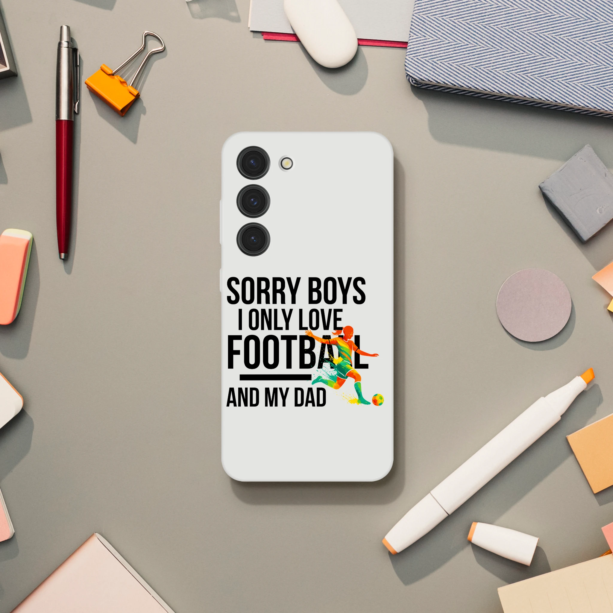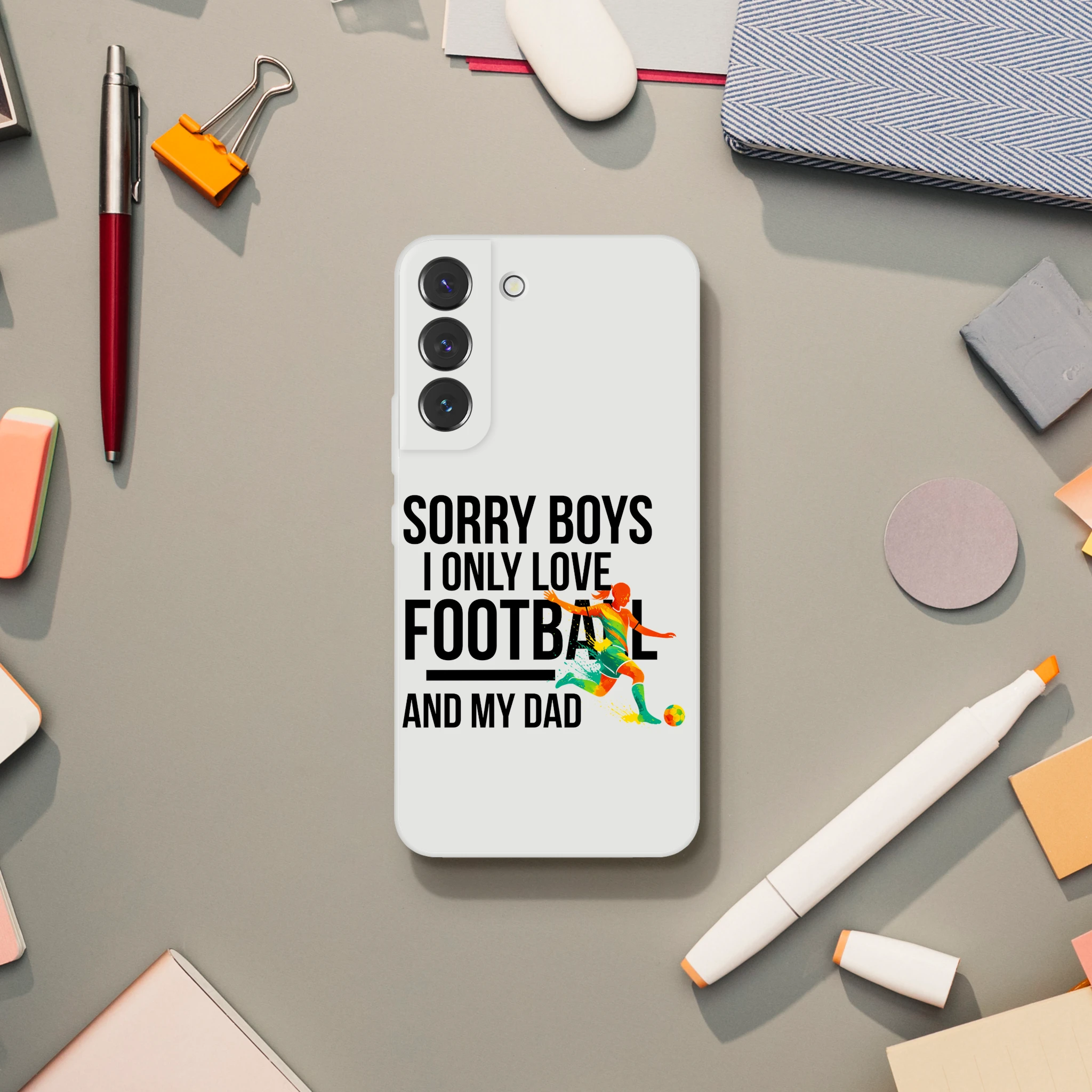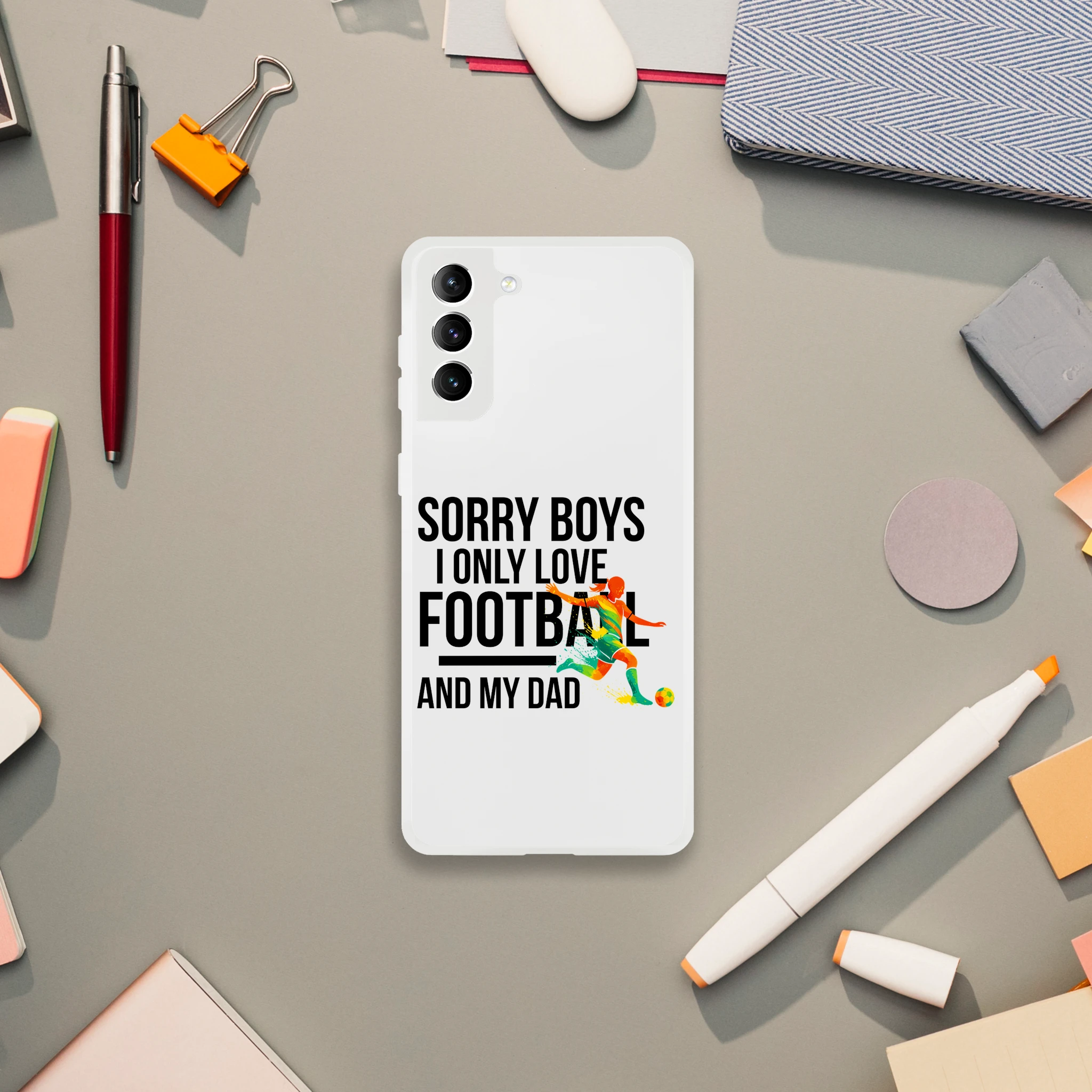Coque Flexi compatible Samsung « Sorry Boys I Only Love Football And My Dad« . Transparente givrée, flexible et résistante.