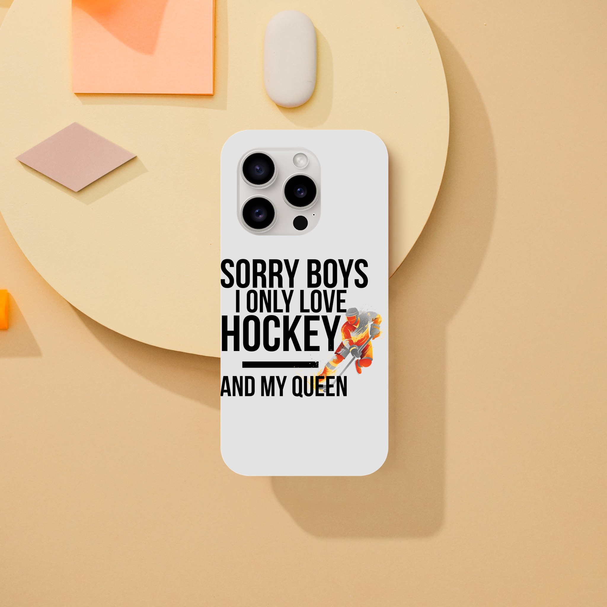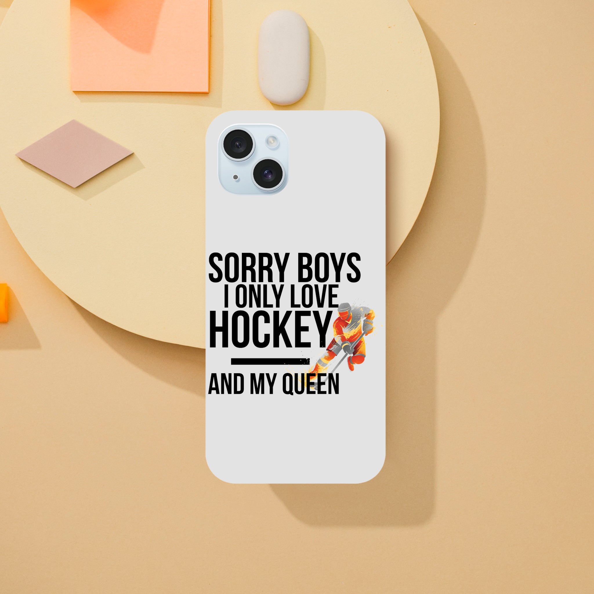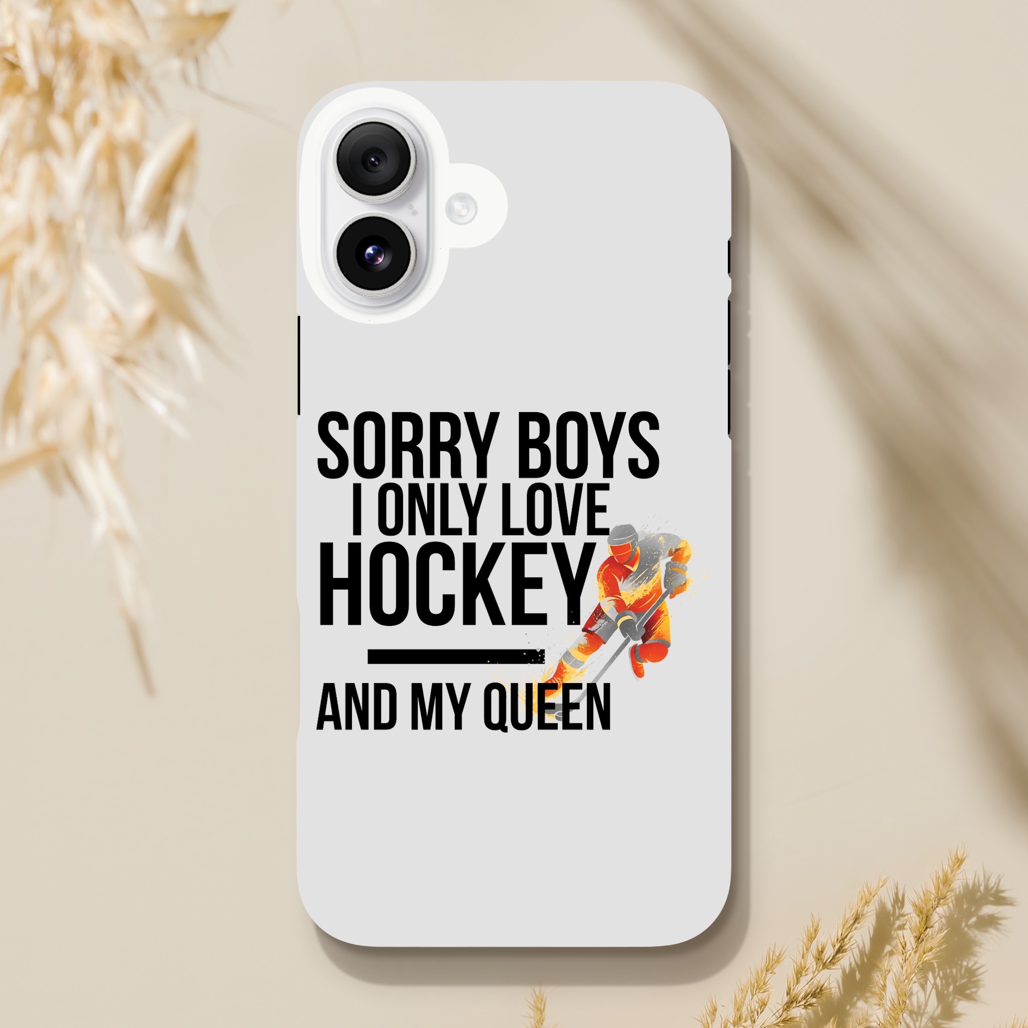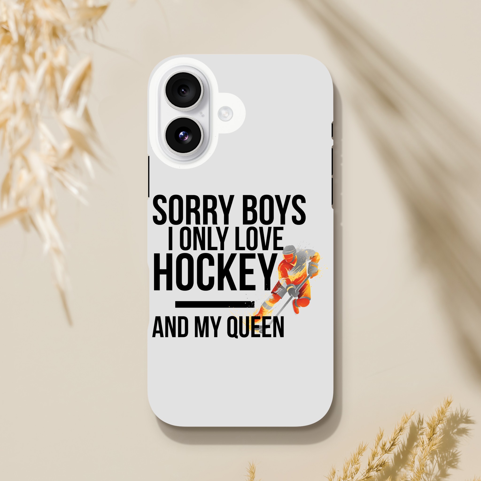 Coque Hockey Queen exclusive « Sorry Boys I Only Love Hockey And My Queen« . Protection double couche élégante pour passionnés. Compatible iPhone.