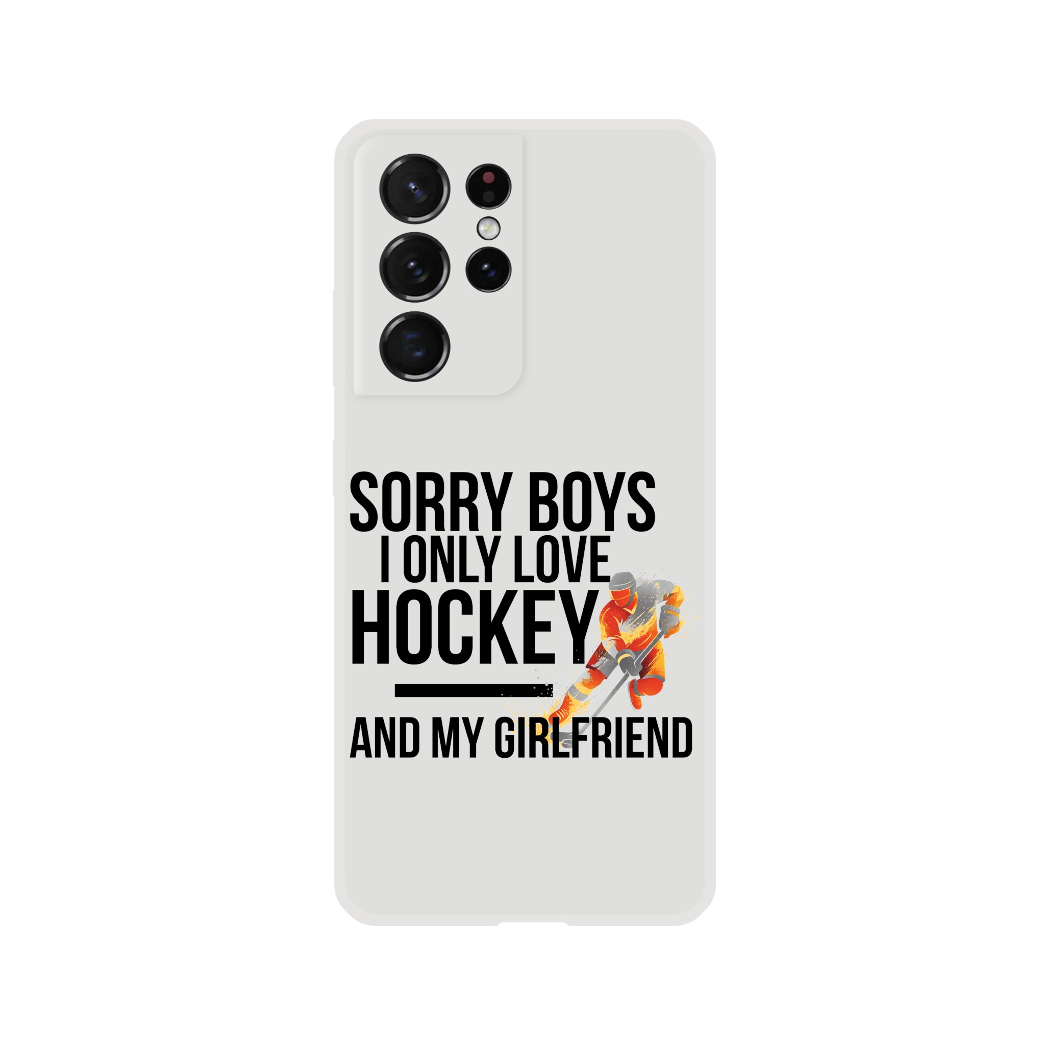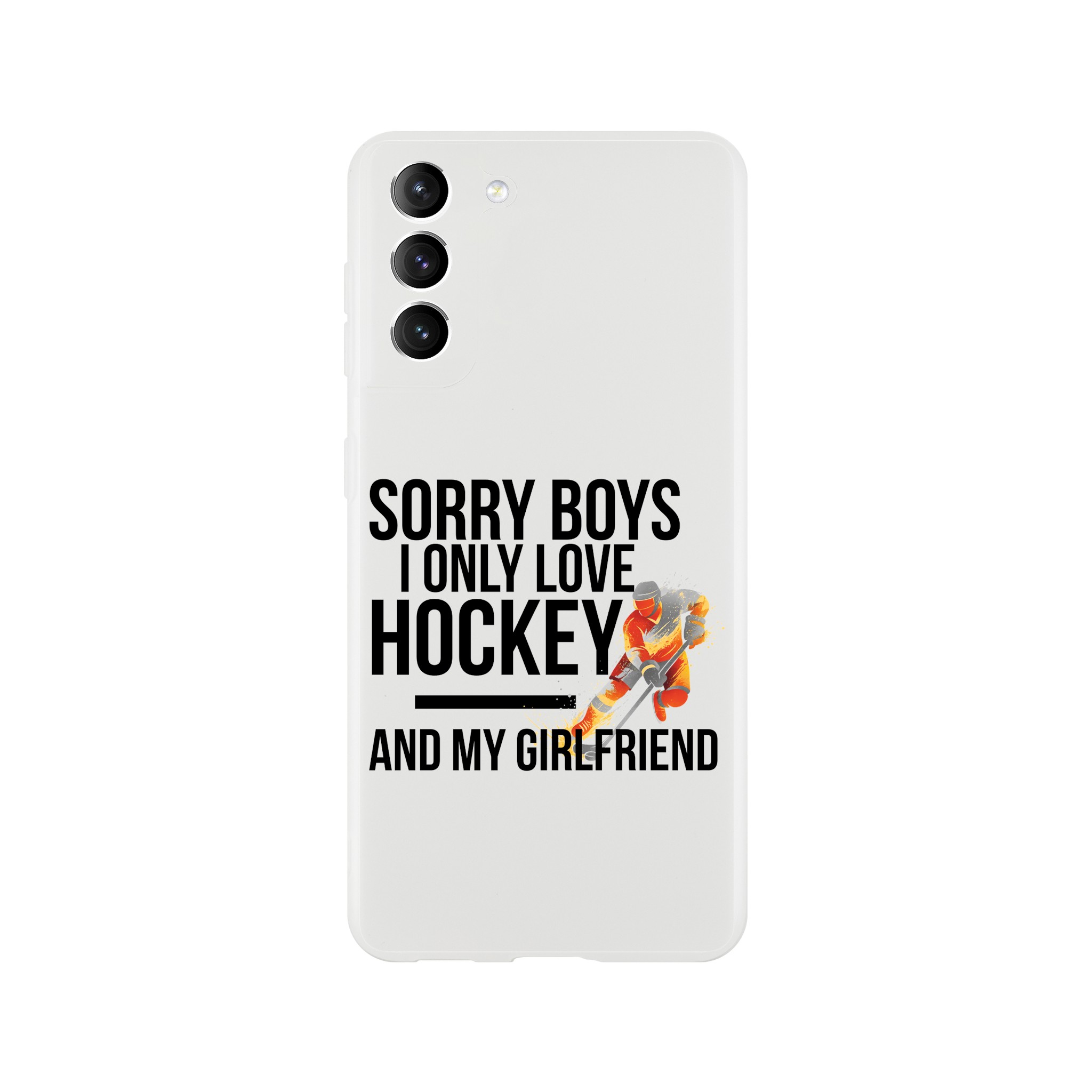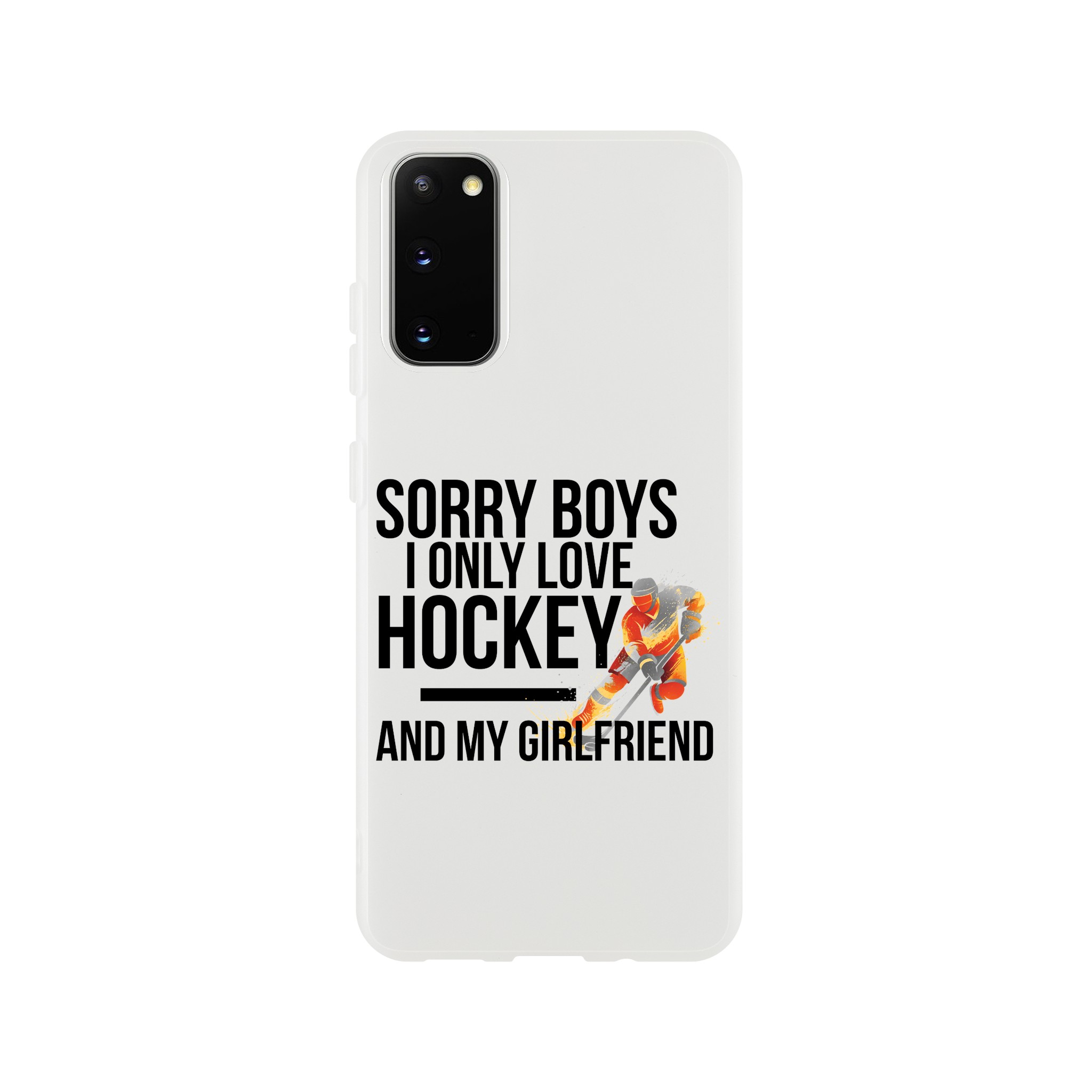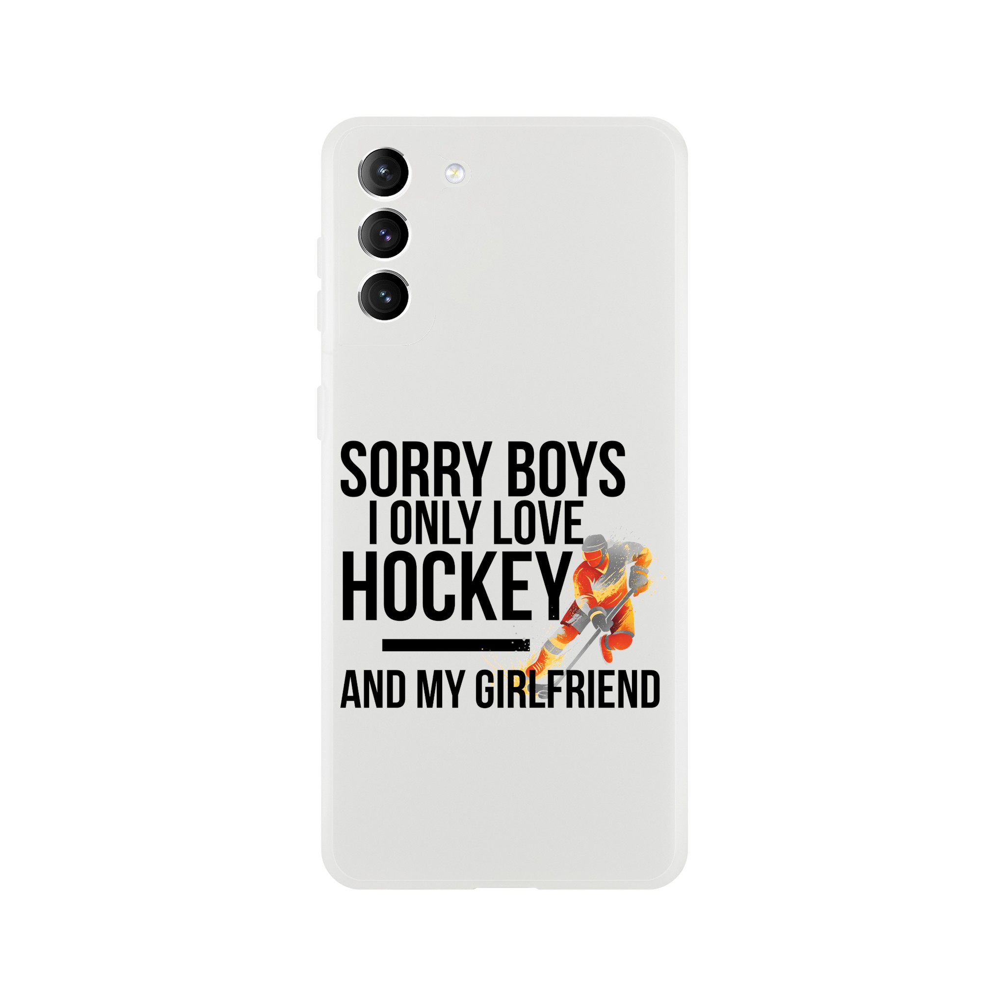 Coque Flexi compatible Samsung « Sorry Boys I Only Love Hockey And My Girlfriend« . Transparente givrée, flexible et résistante.
