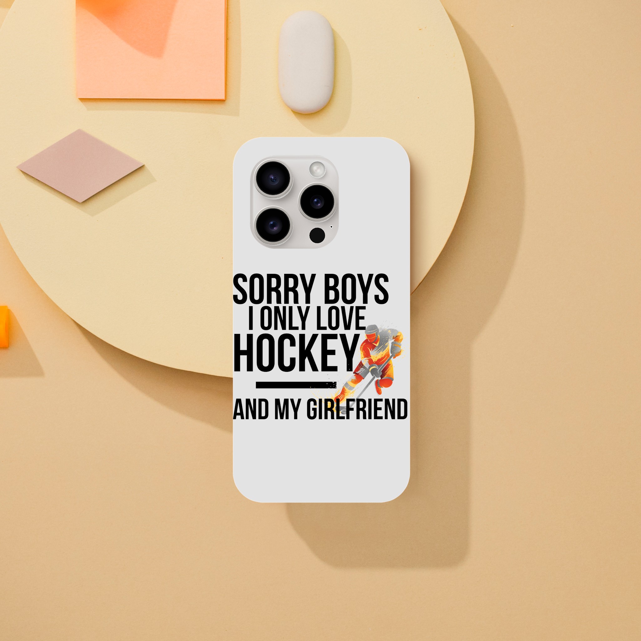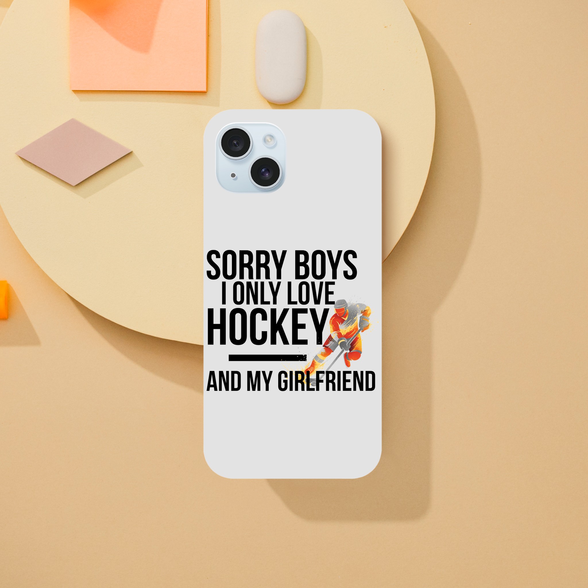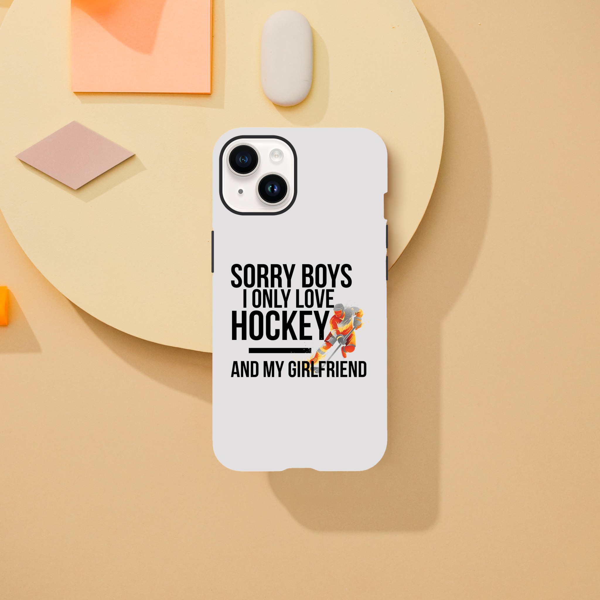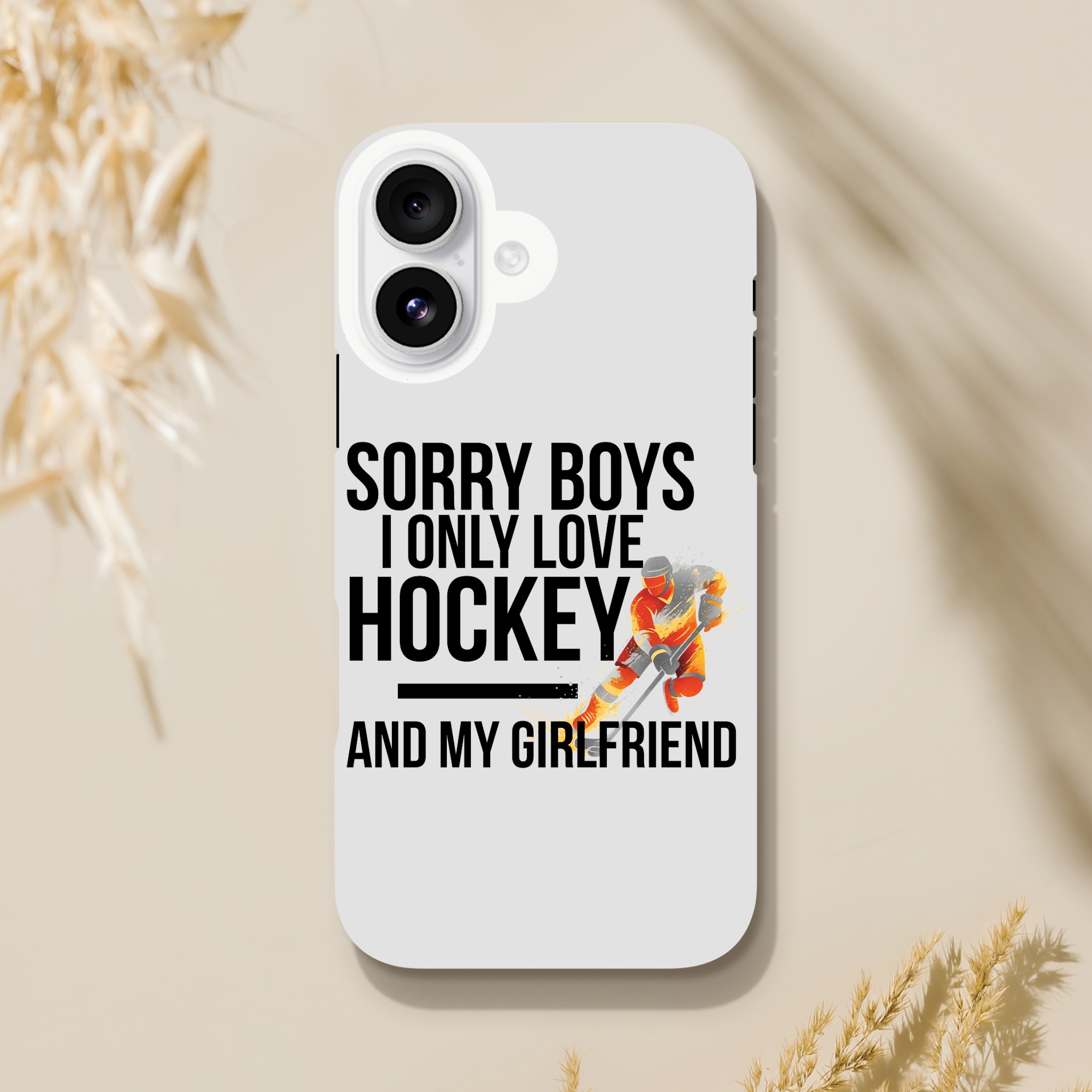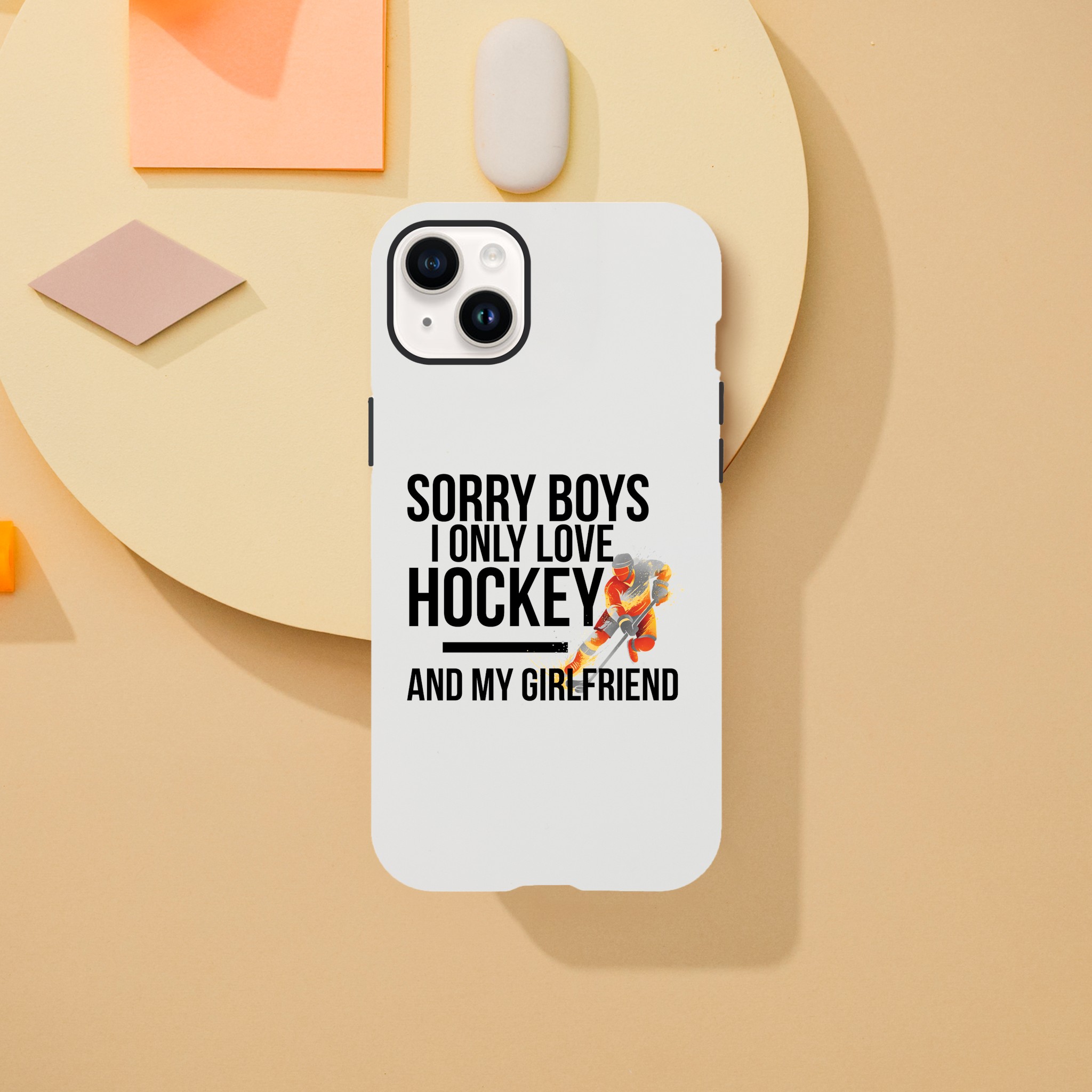 Coque Hockey Girlfriend exclusive « Sorry Boys I Only Love Hockey And My Girlfriend ». Protection double couche élégante pour passionnés. Compatible iPhone.