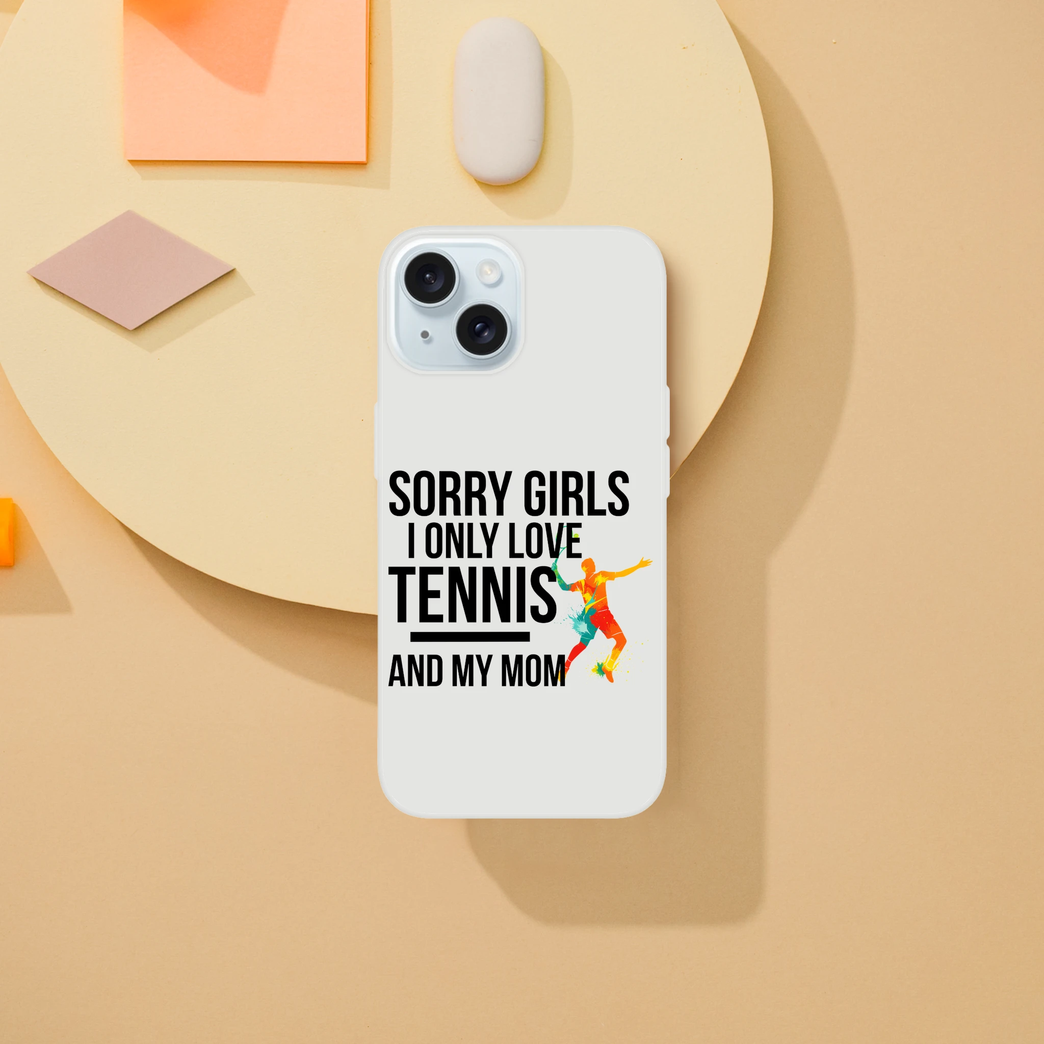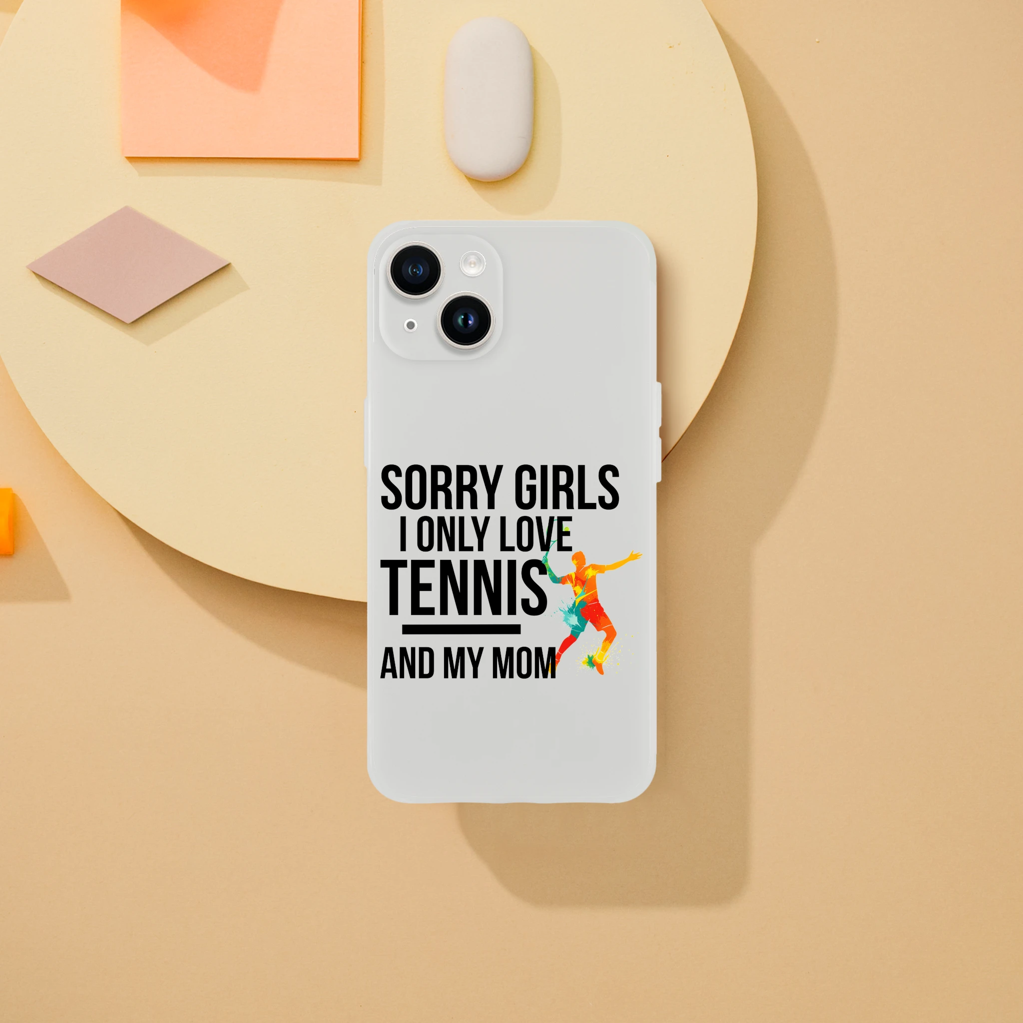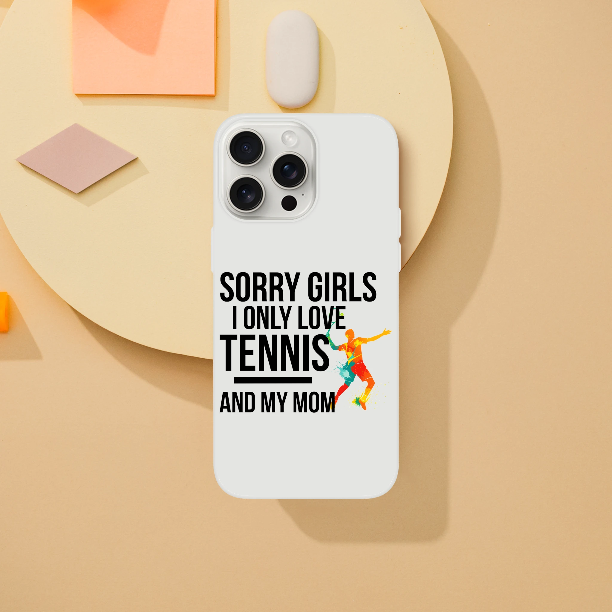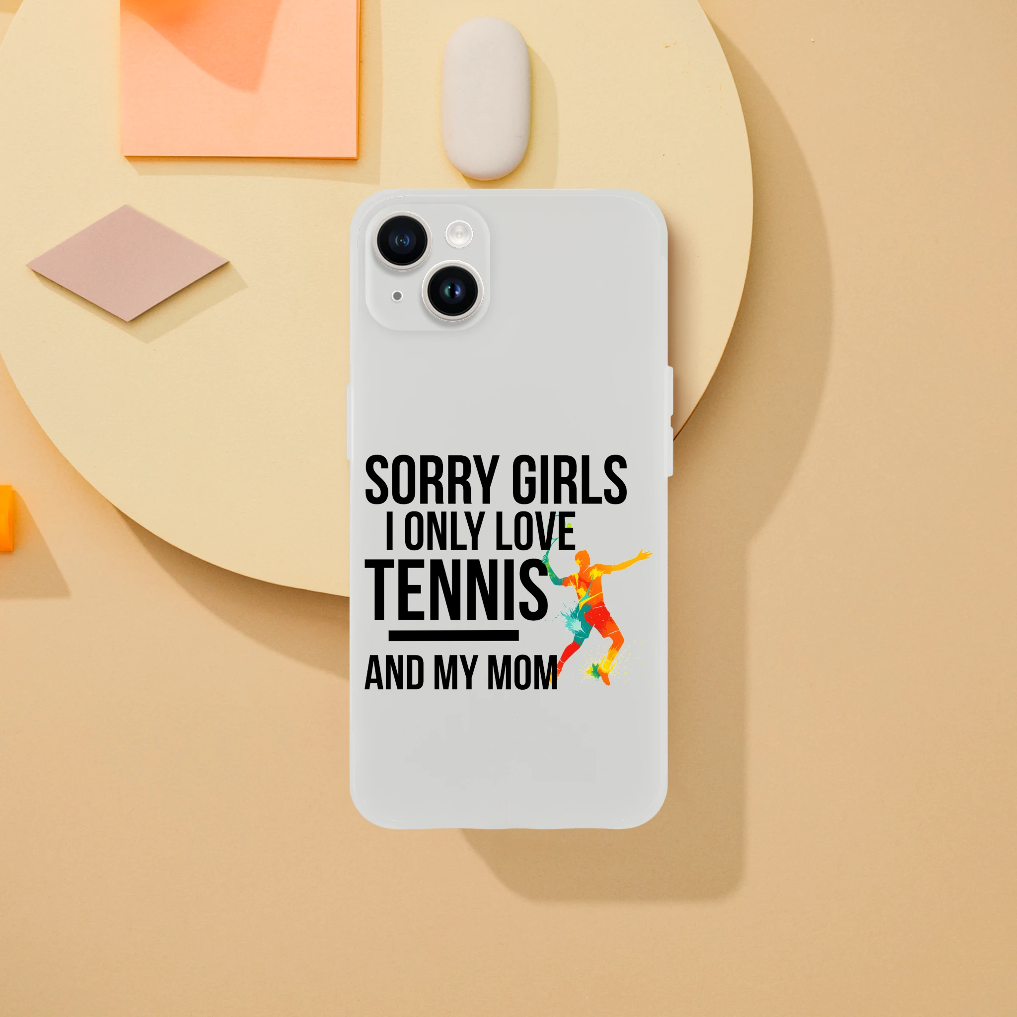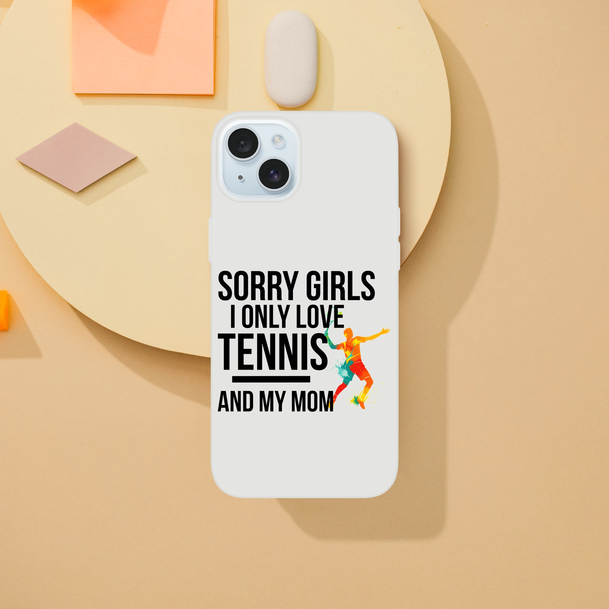 Coque Flexi compatible iPhone « Sorry Girls I Only Love Tennis And My Mom« . Transparente givrée, flexible et résistante.