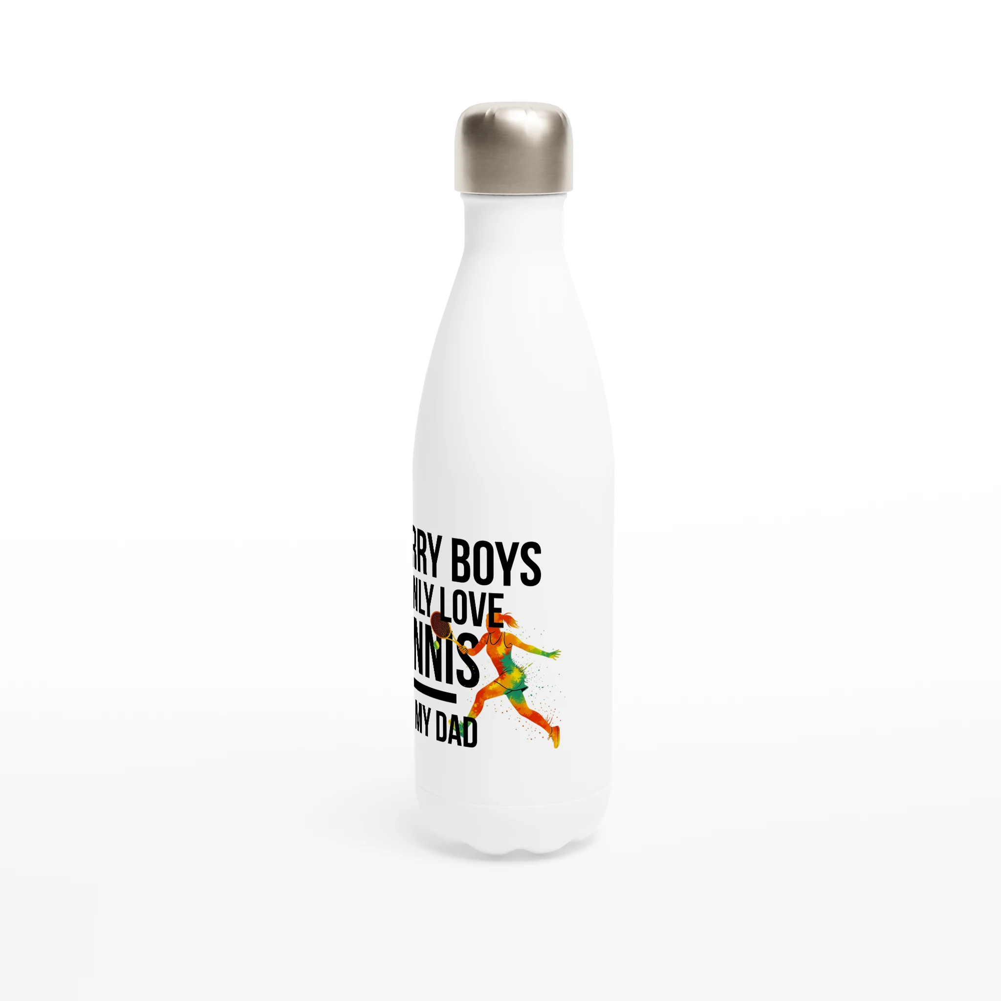 Bouteille sport personnalisée « Sorry Boys I Only Love Tennis And My Dad« . Acier inoxydable 483ml (17oz), double paroi, garde température 6h, étanche, design élégant.