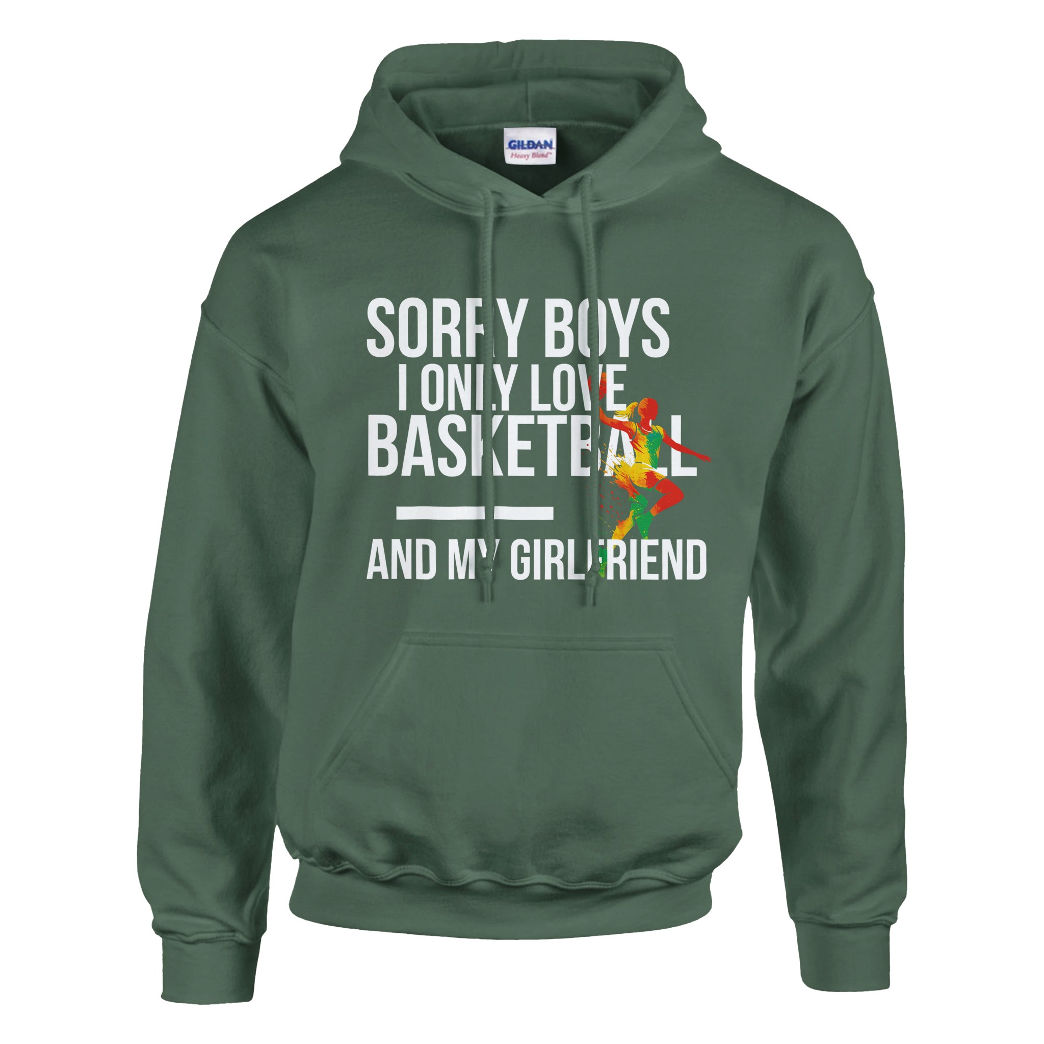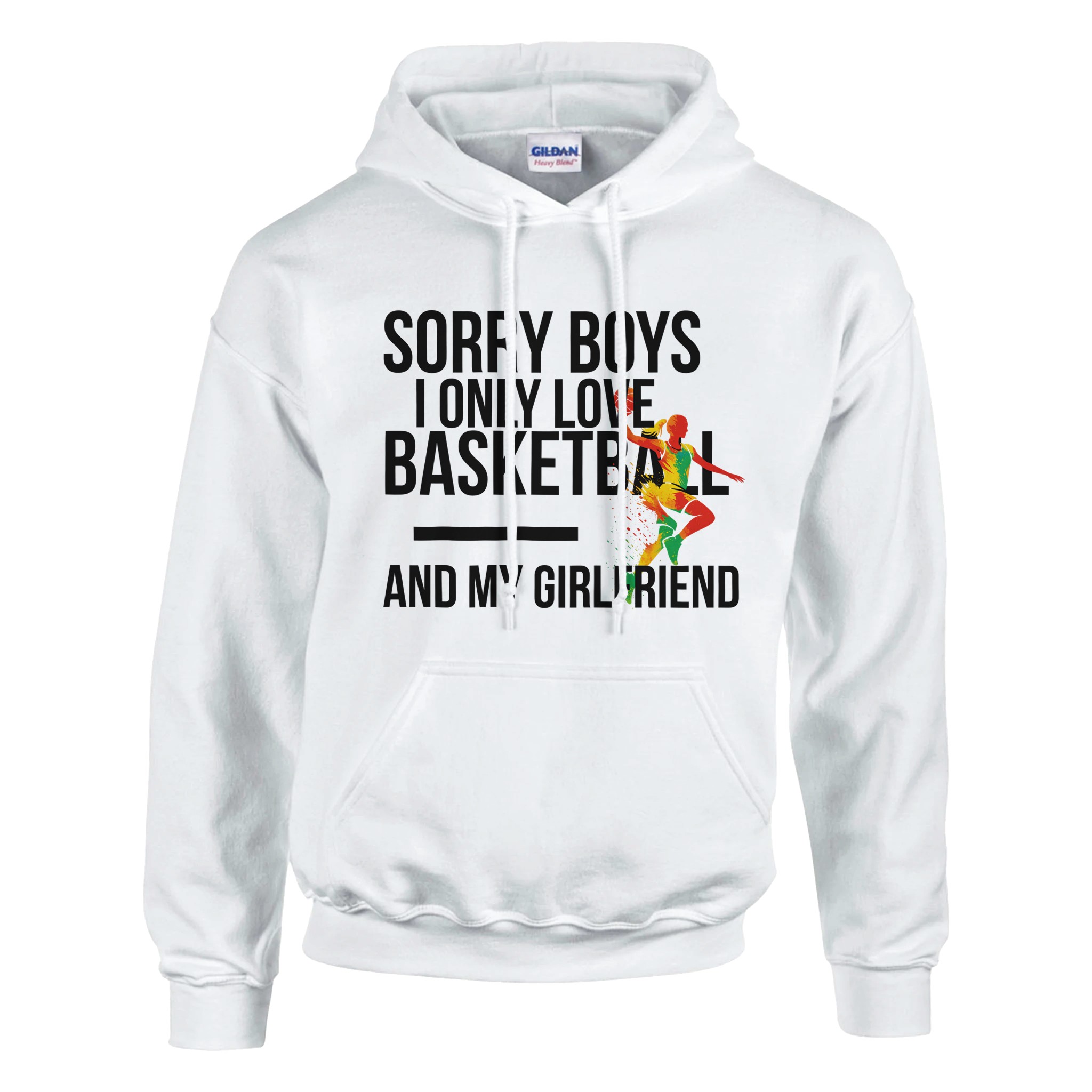 Sweat à capuche sport personnalisé « Sorry Boys I Only Love Basketball And My Girlfriend« . Mélange coton/polyester épais, capuche doublée avec cordon, poche ventrale, confort optimal.