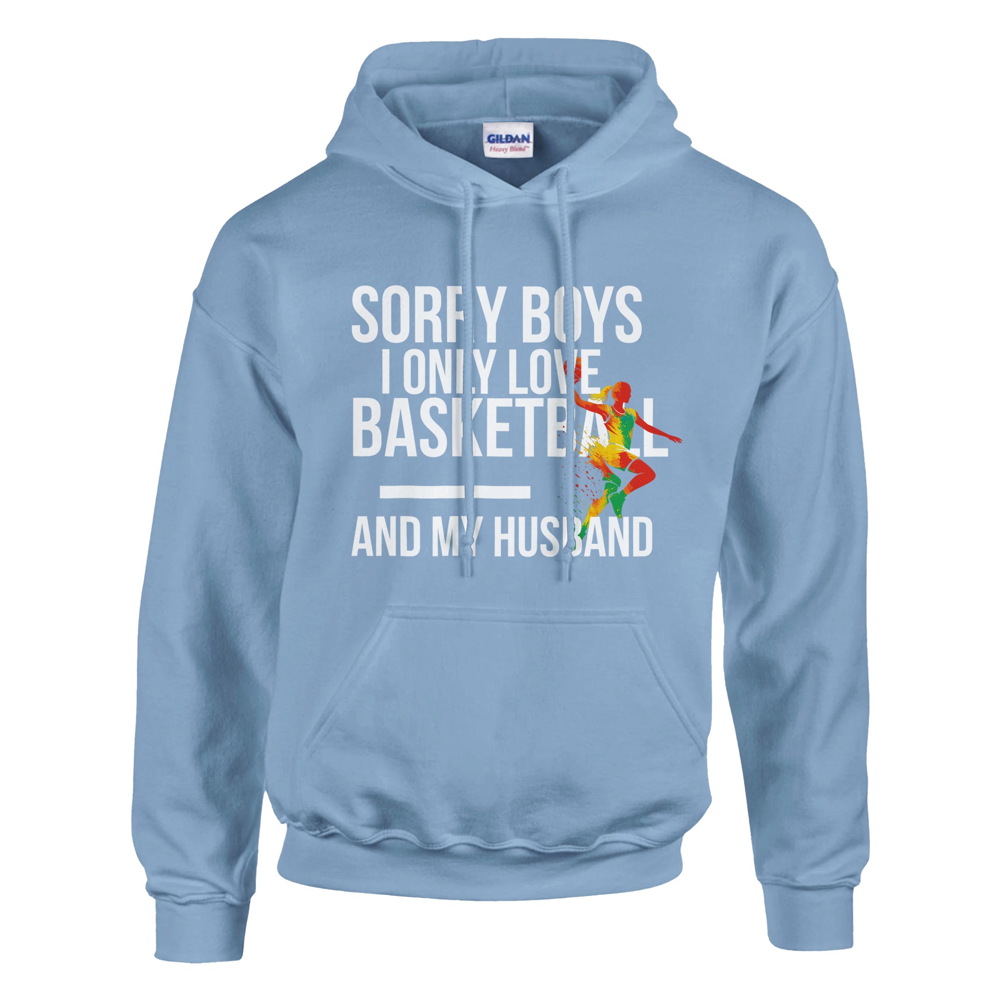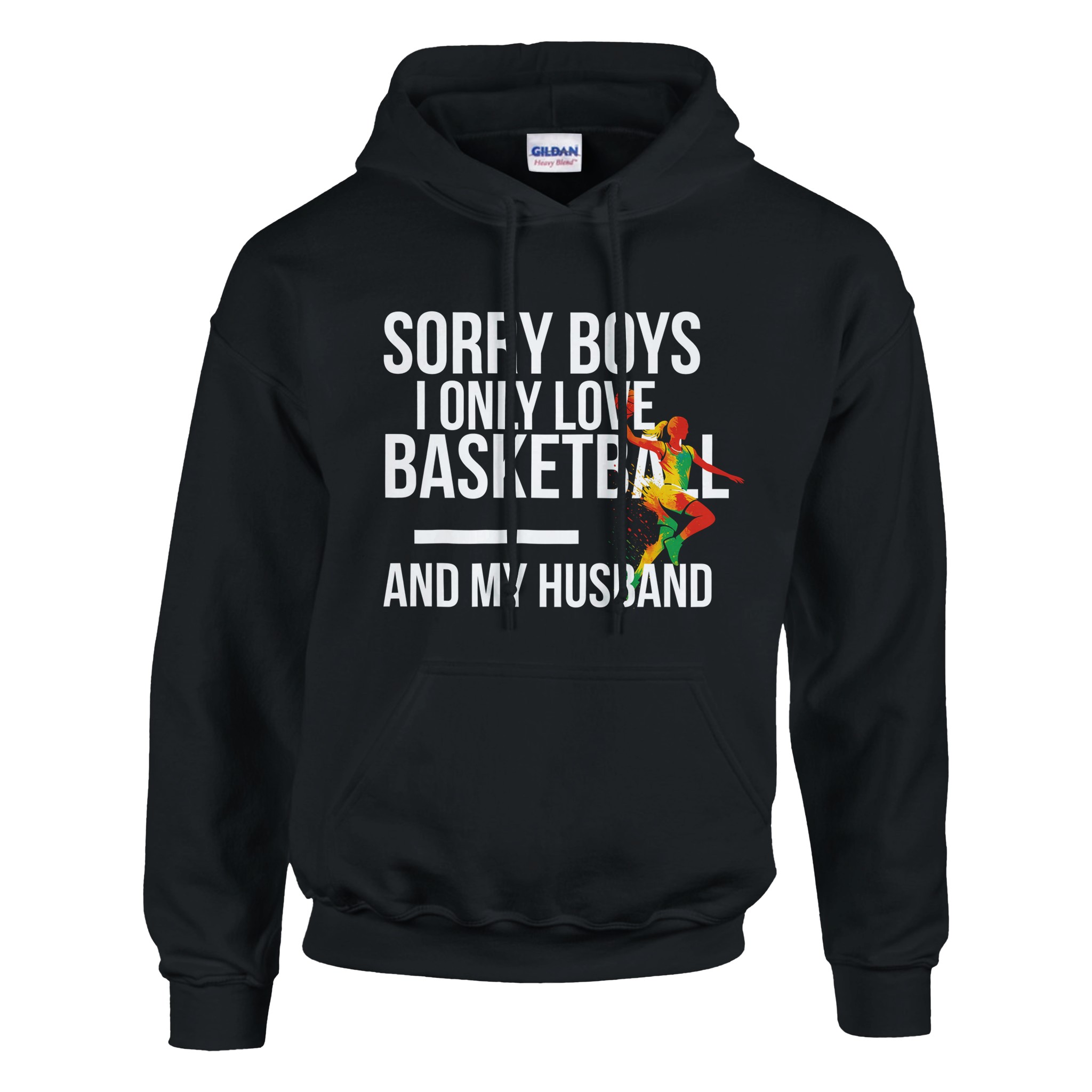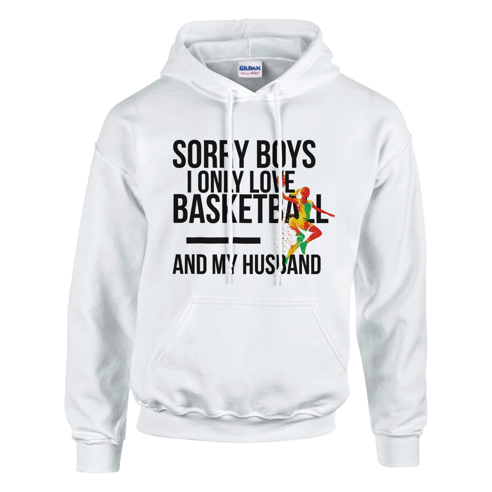 Sweat à capuche sport personnalisé « Sorry Boys I Only Love Basketball And My Husband« . Mélange coton/polyester épais, capuche doublée avec cordon, poche ventrale, confort optimal.
