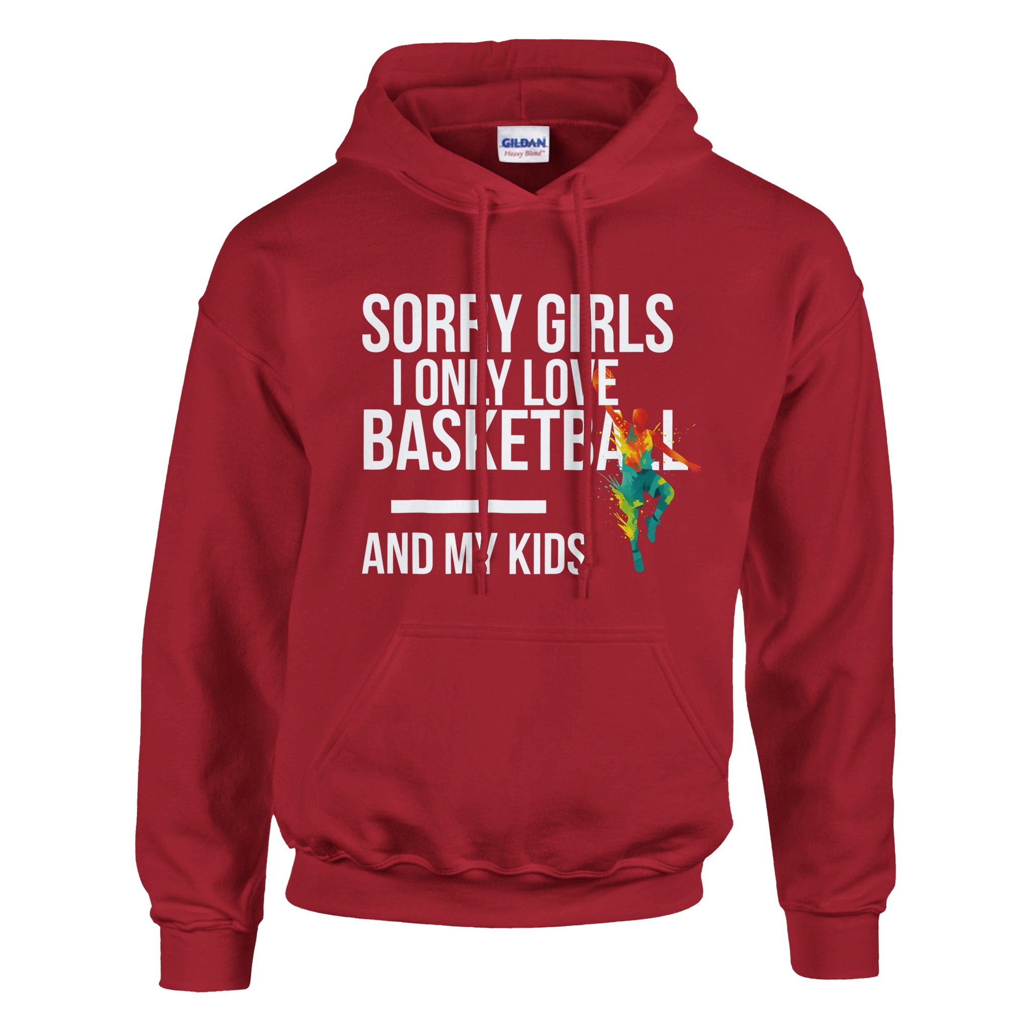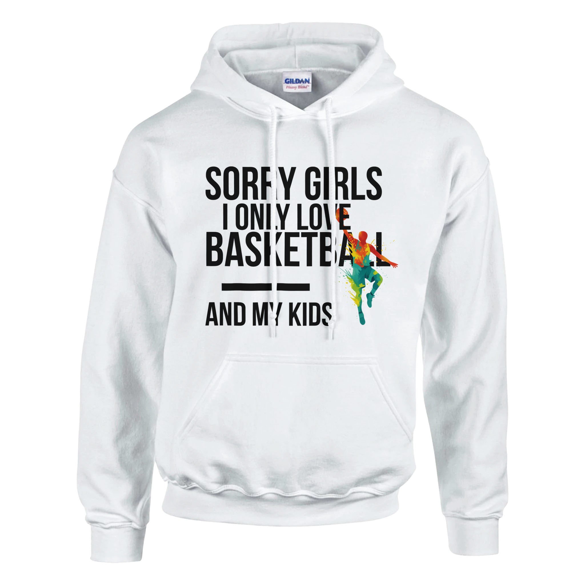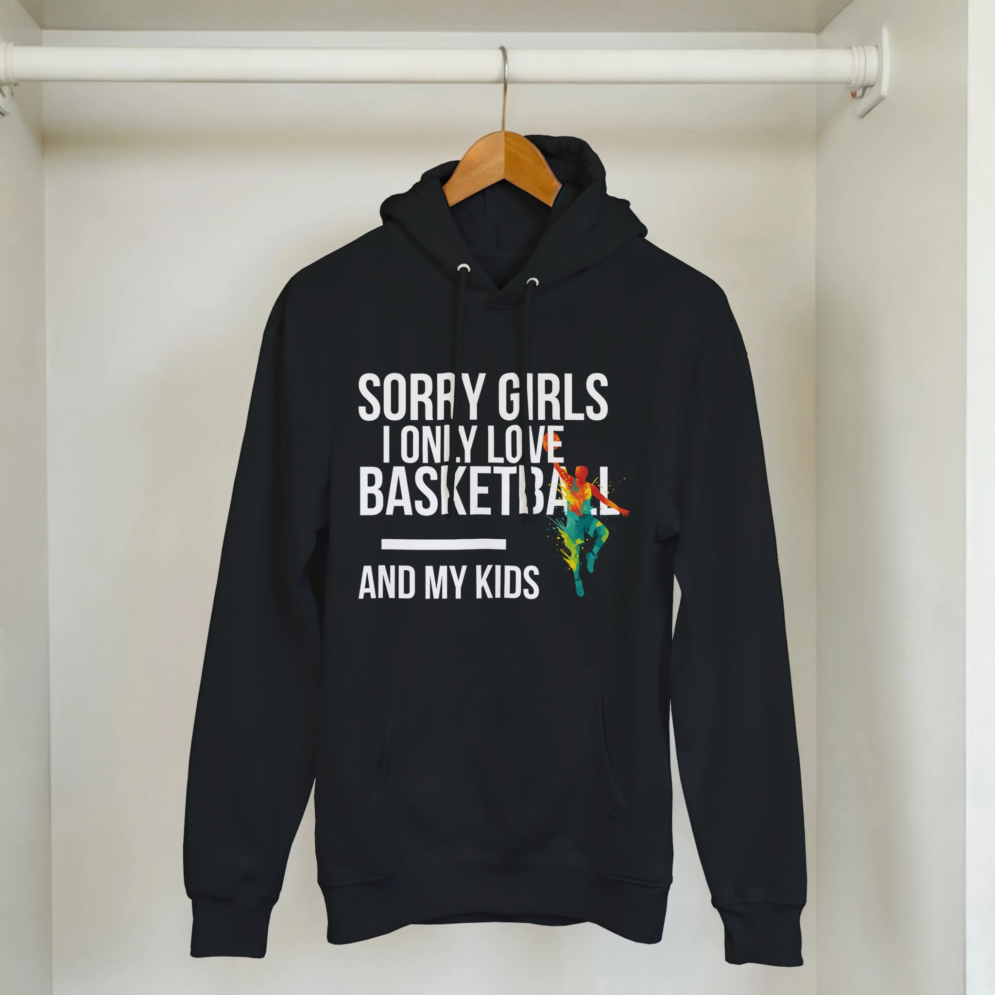 Sweat à capuche sport personnalisé « Sorry Girls I Only Love Basketball And My Kids« . Mélange coton/polyester épais, capuche doublée avec cordon, poche ventrale, confort optimal.