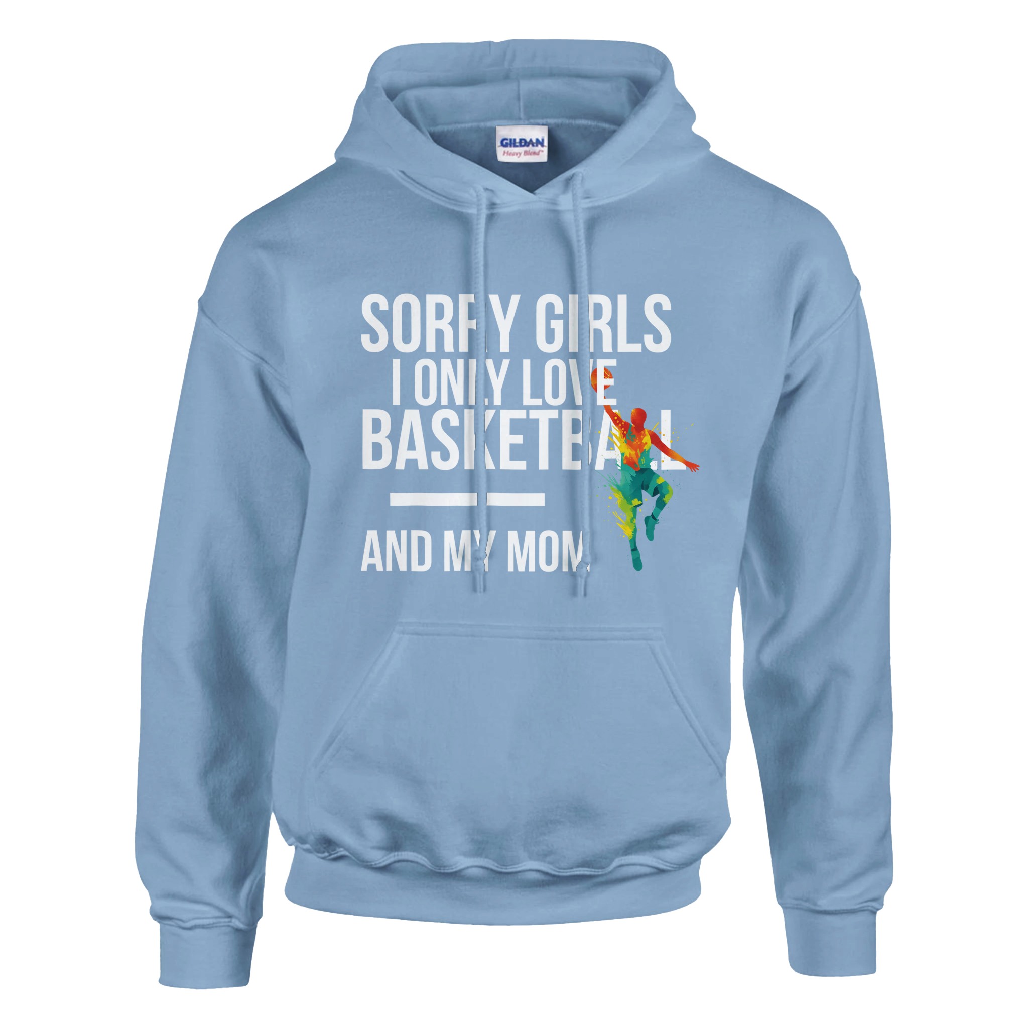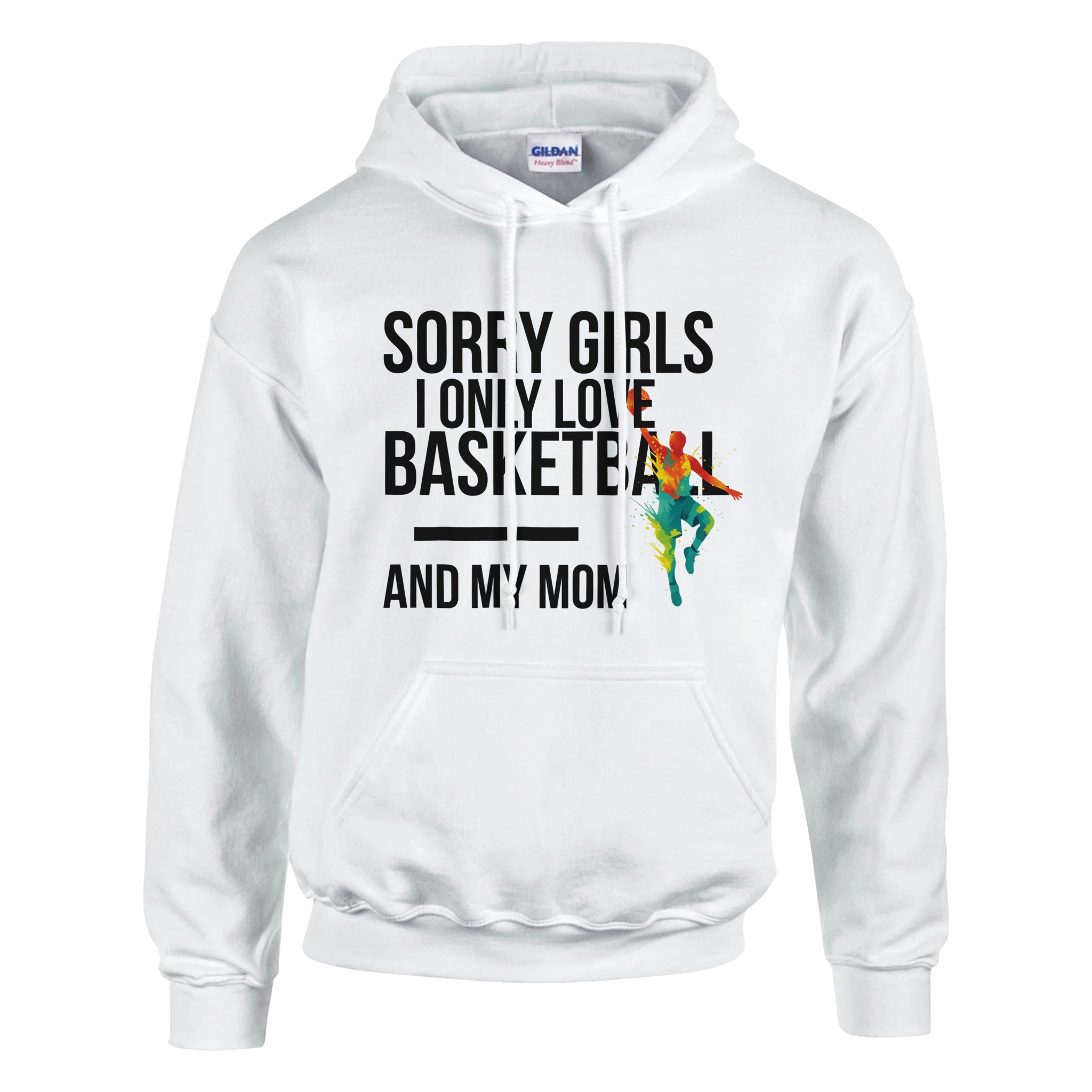 Sweat à capuche sport personnalisé « Sorry Girls I Only Love Basketball And My Mom« . Mélange coton/polyester épais, capuche doublée avec cordon, poche ventrale, confort optimal.