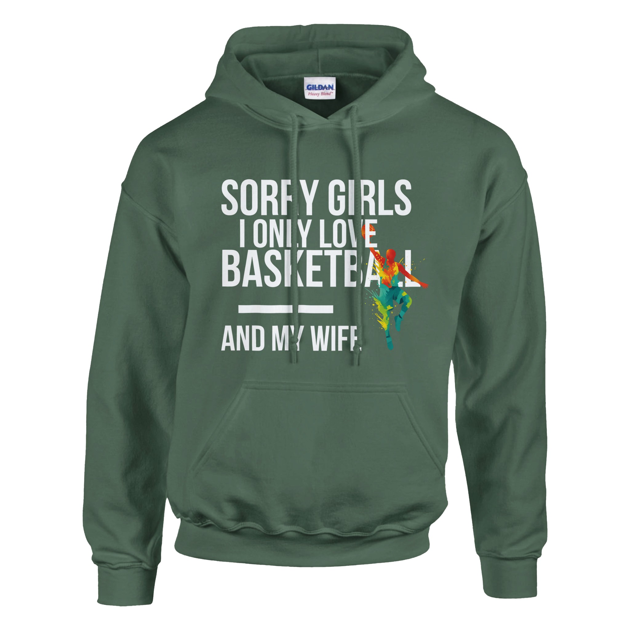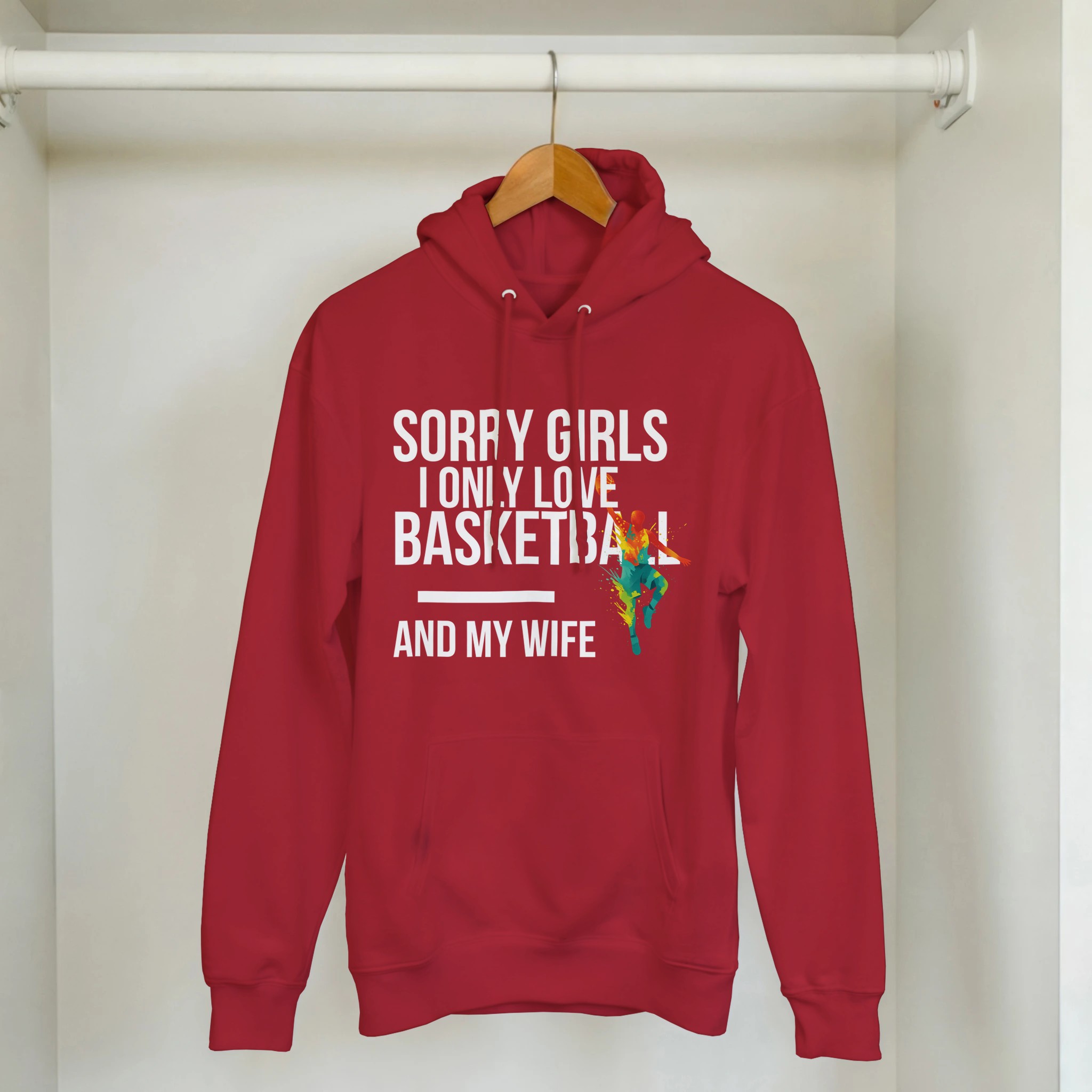 Sweat à capuche sport personnalisé « Sorry Girls I Only Love Basketball And My Wife« . Mélange coton/polyester épais, capuche doublée avec cordon, poche ventrale, confort optimal.