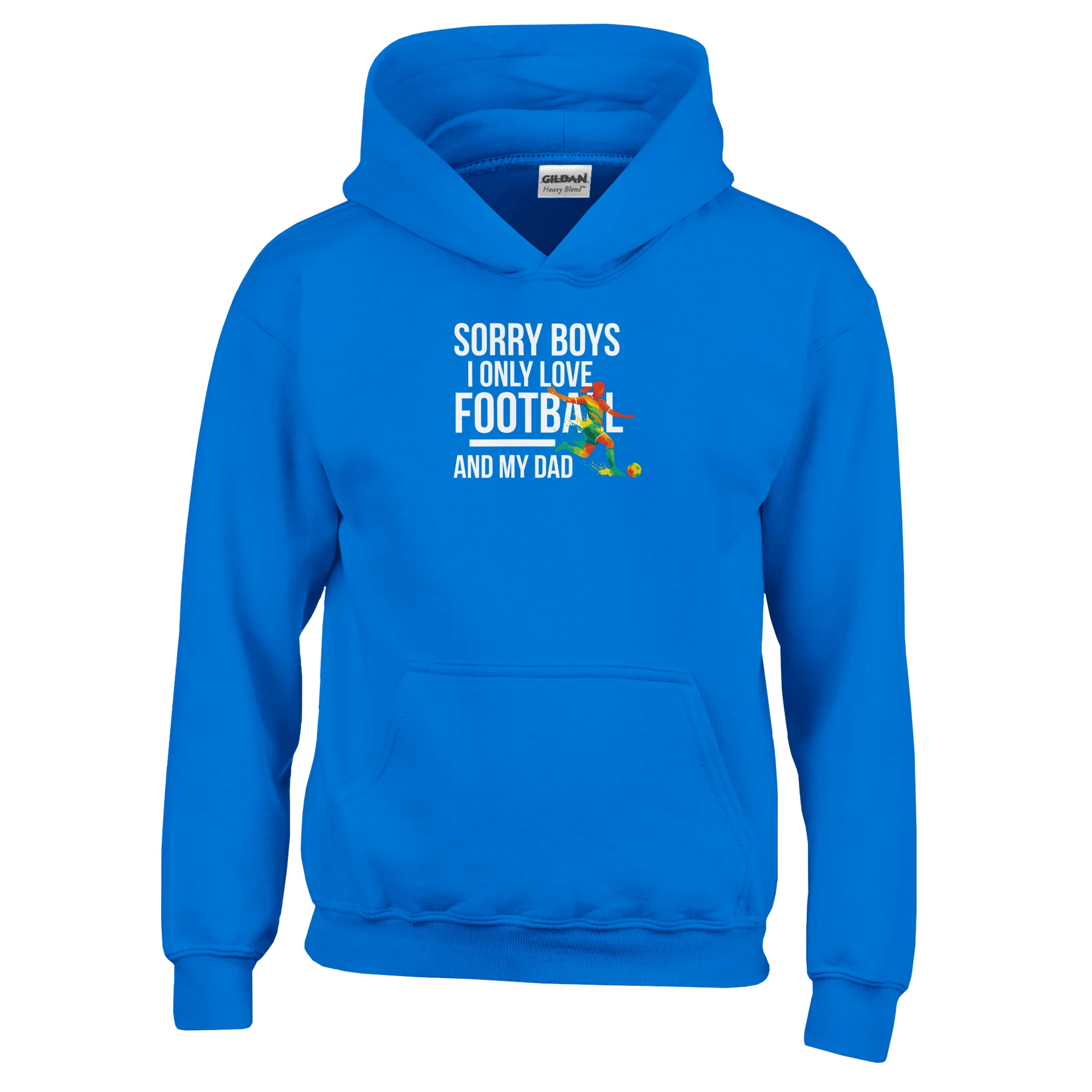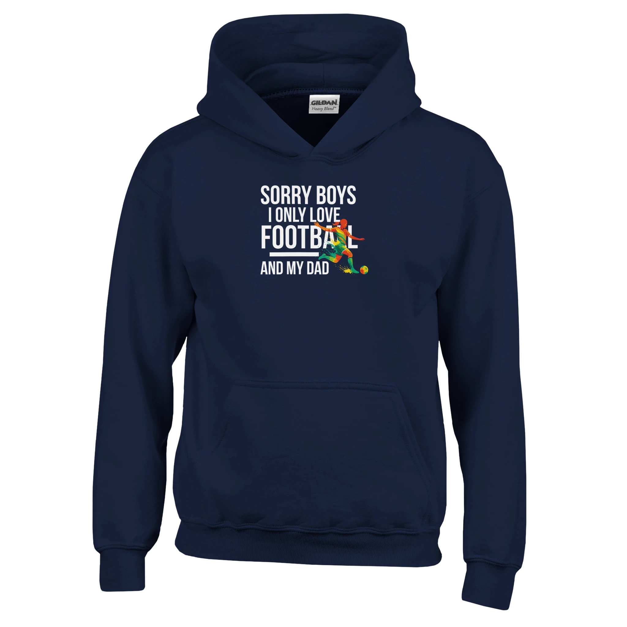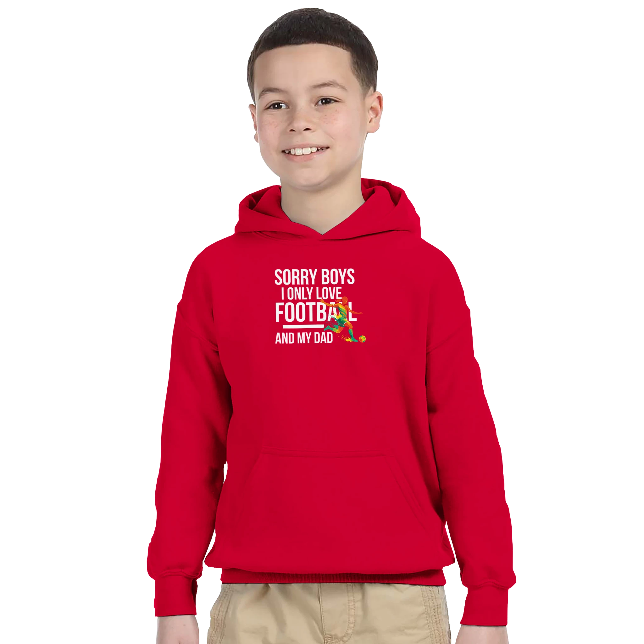 Sweat à capuche enfant sport personnalisé « Sorry Boys I Only Love Football And My Dad« . Gildan 18500B épais, mélange coton/polyester doux, capuche doublée, poche ventrale.