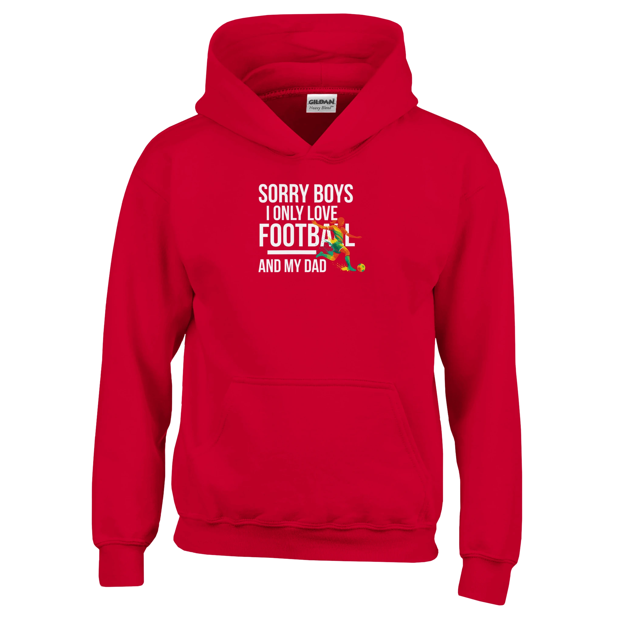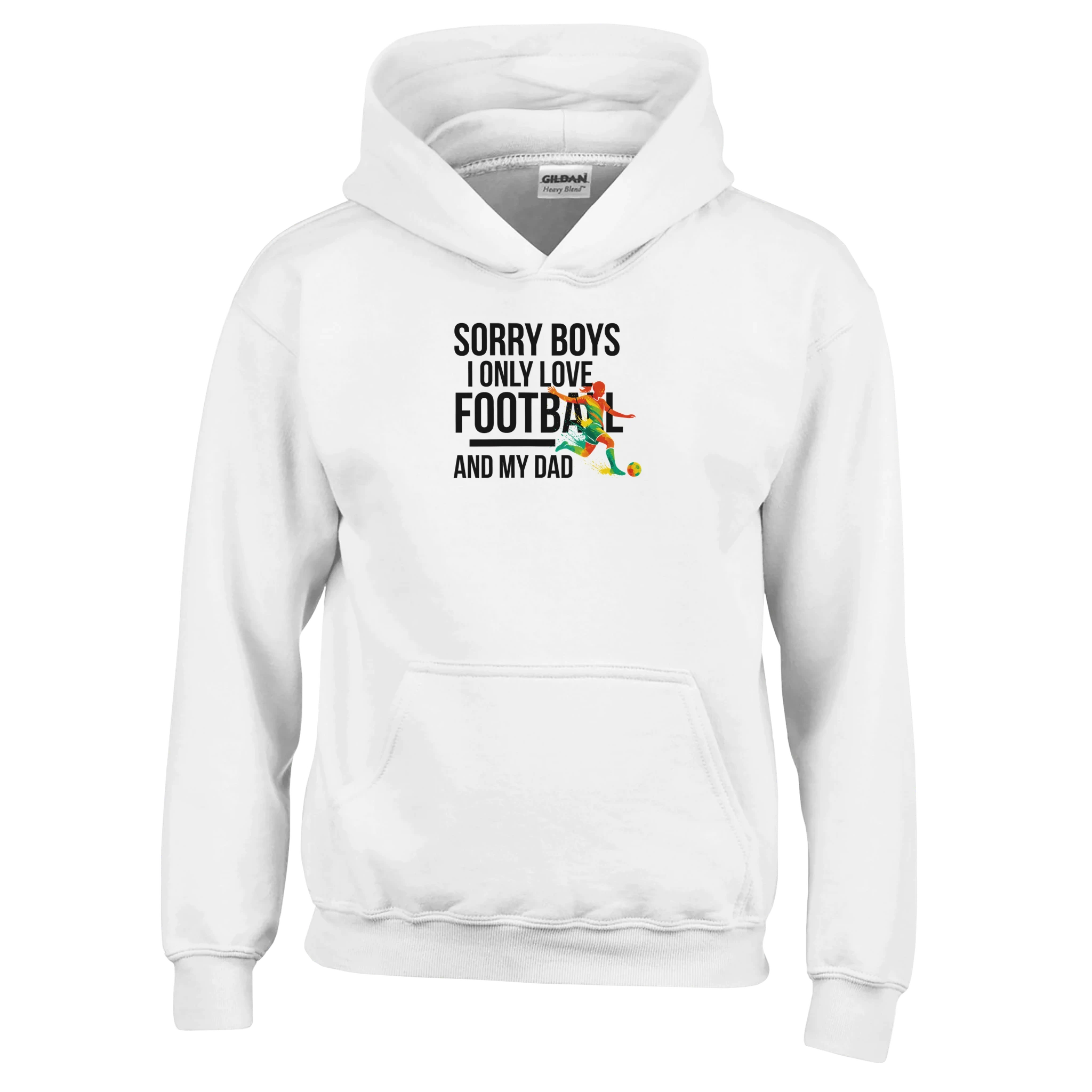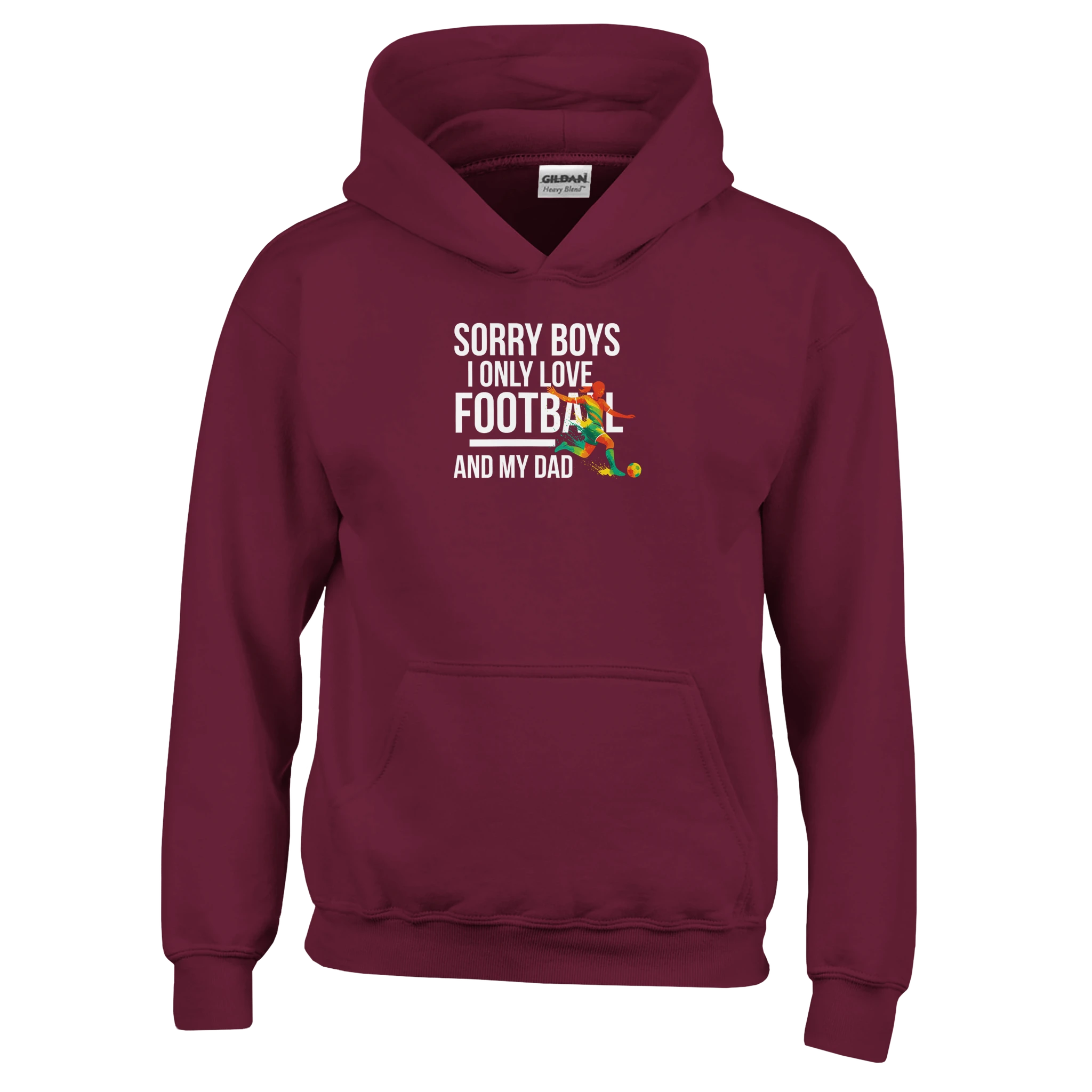 Sweat à capuche enfant sport personnalisé « Sorry Boys I Only Love Football And My Dad« . Gildan 18500B épais, mélange coton/polyester doux, capuche doublée, poche ventrale.