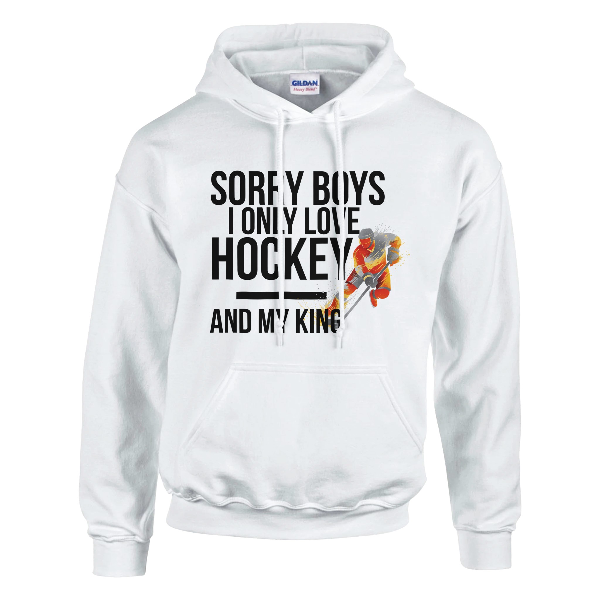 Sweat à capuche sport personnalisé « Sorry Boys I Only Love Hockey And My King« . Mélange coton/polyester épais, capuche doublée avec cordon, poche ventrale, confort optimal.