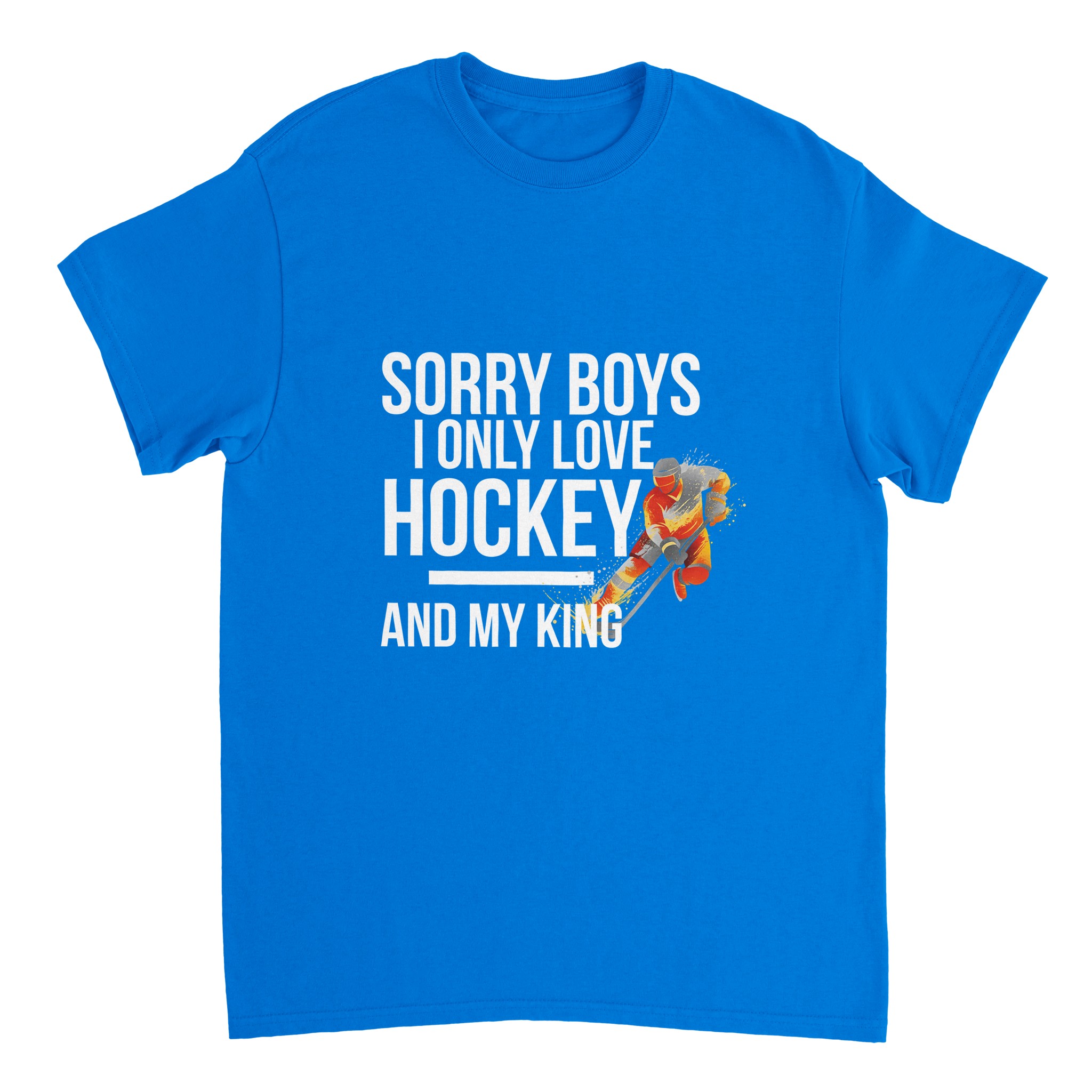 T-shirt personnalisé Gildan 5000 « Sorry Boys I Only Love Hockey And My King« . Coton épais 100% durable, coupe classique unisexe. L’incontournable des t-shirts personnalisés.