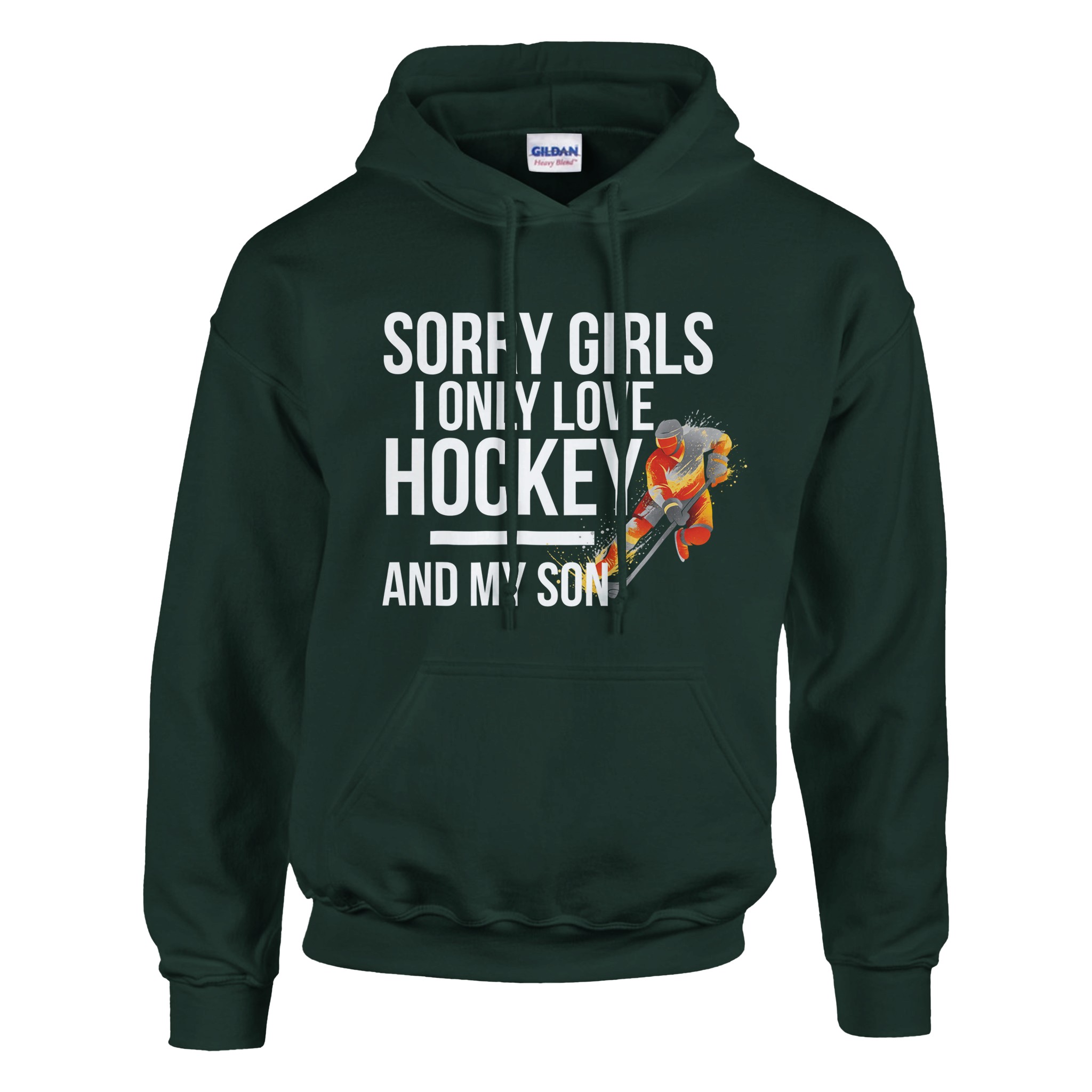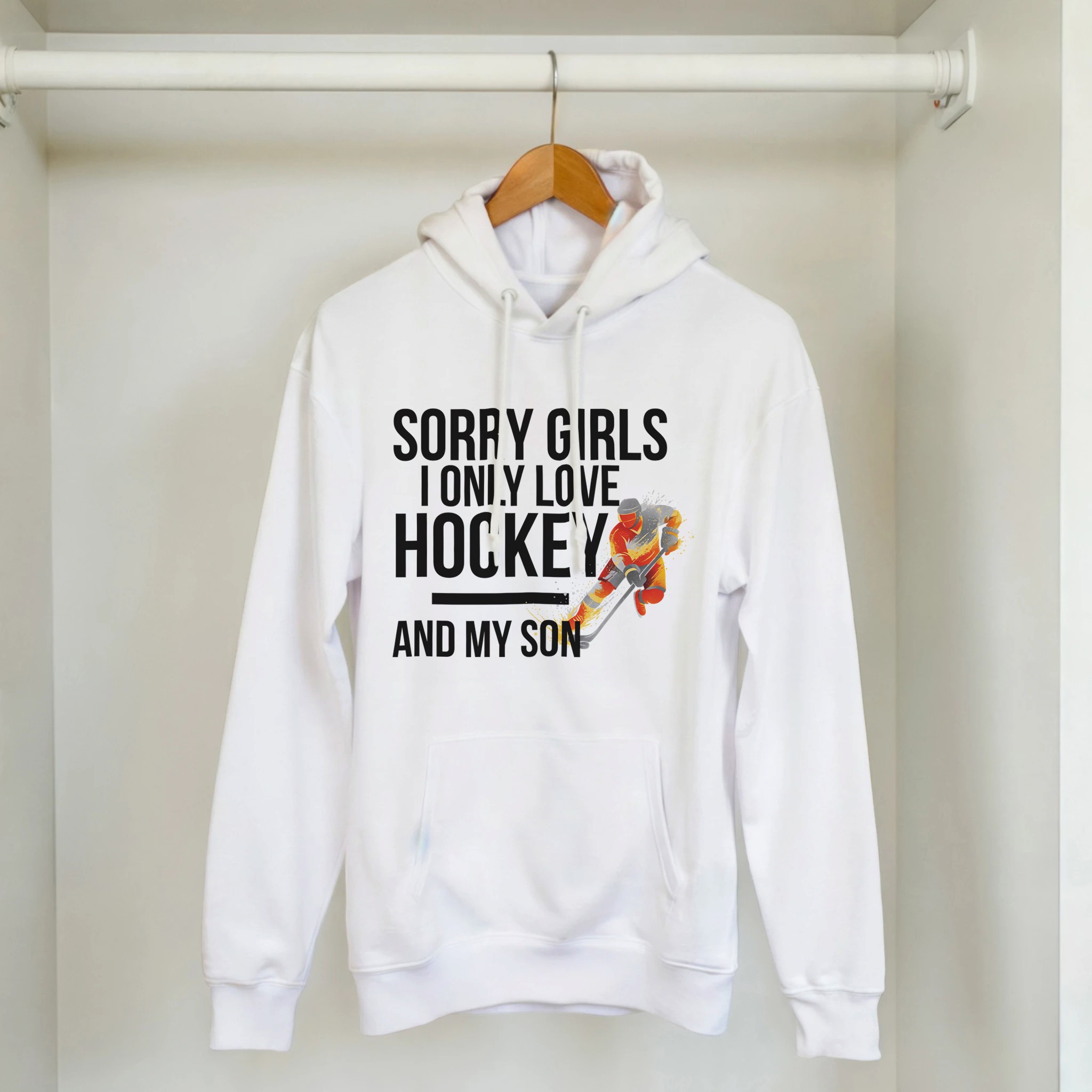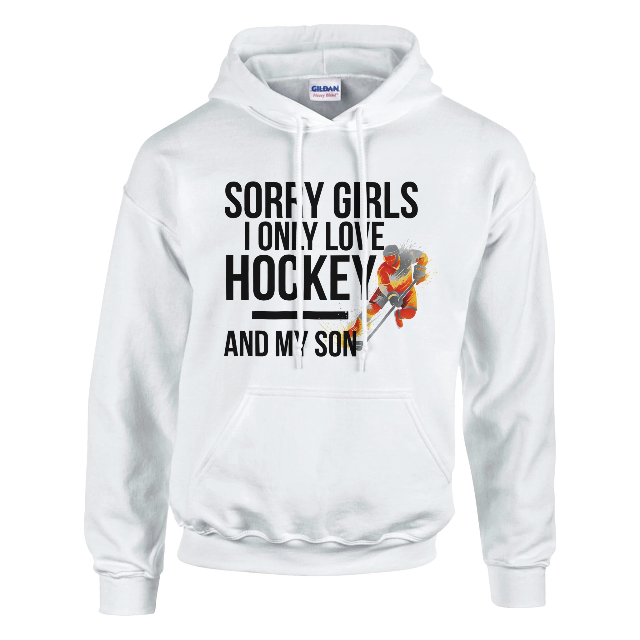 - Sweat à capuche sport personnalisé « Sorry Girls I Only Love Hockey And My Son« . Mélange coton/polyester épais, capuche doublée avec cordon, poche ventrale, confort optimal.
