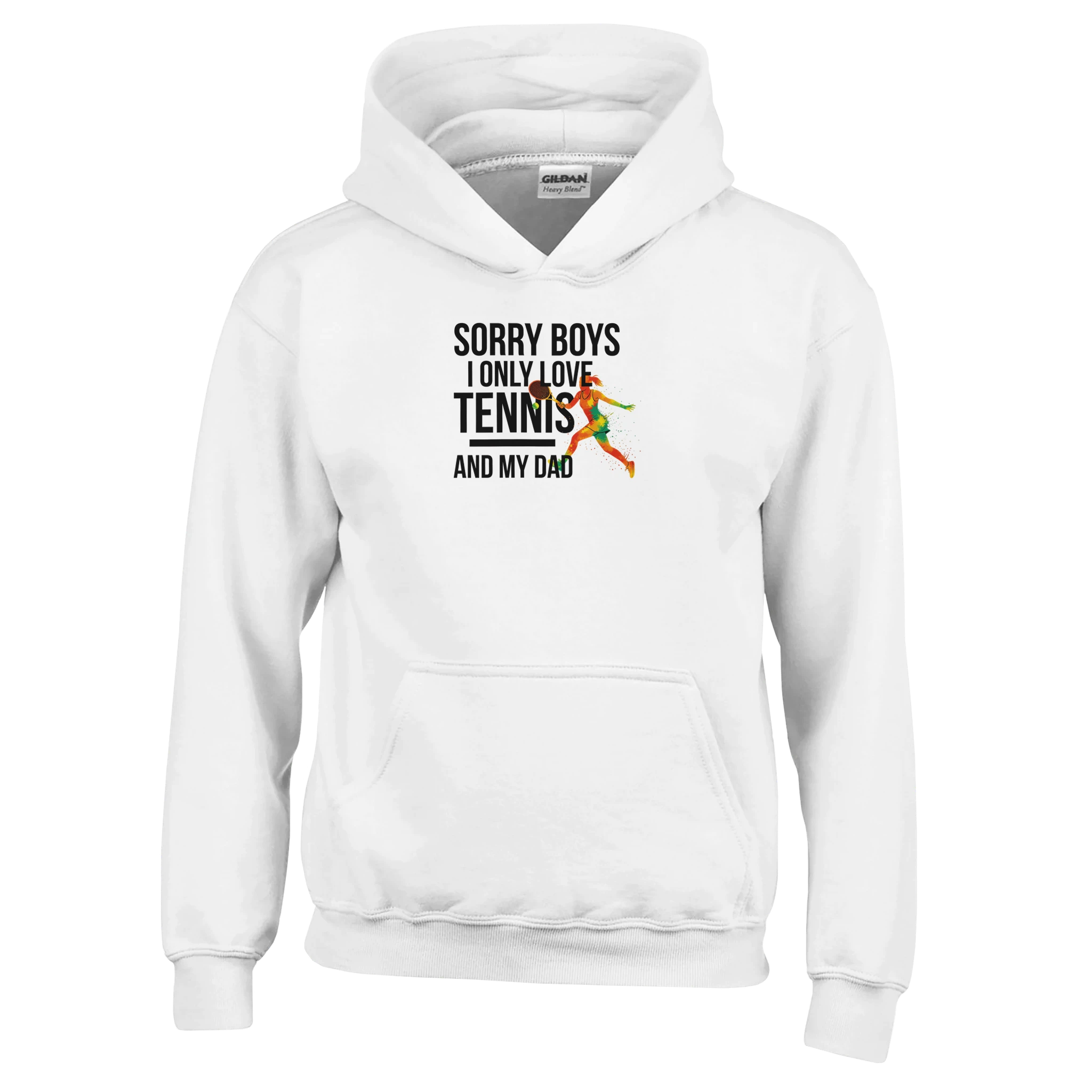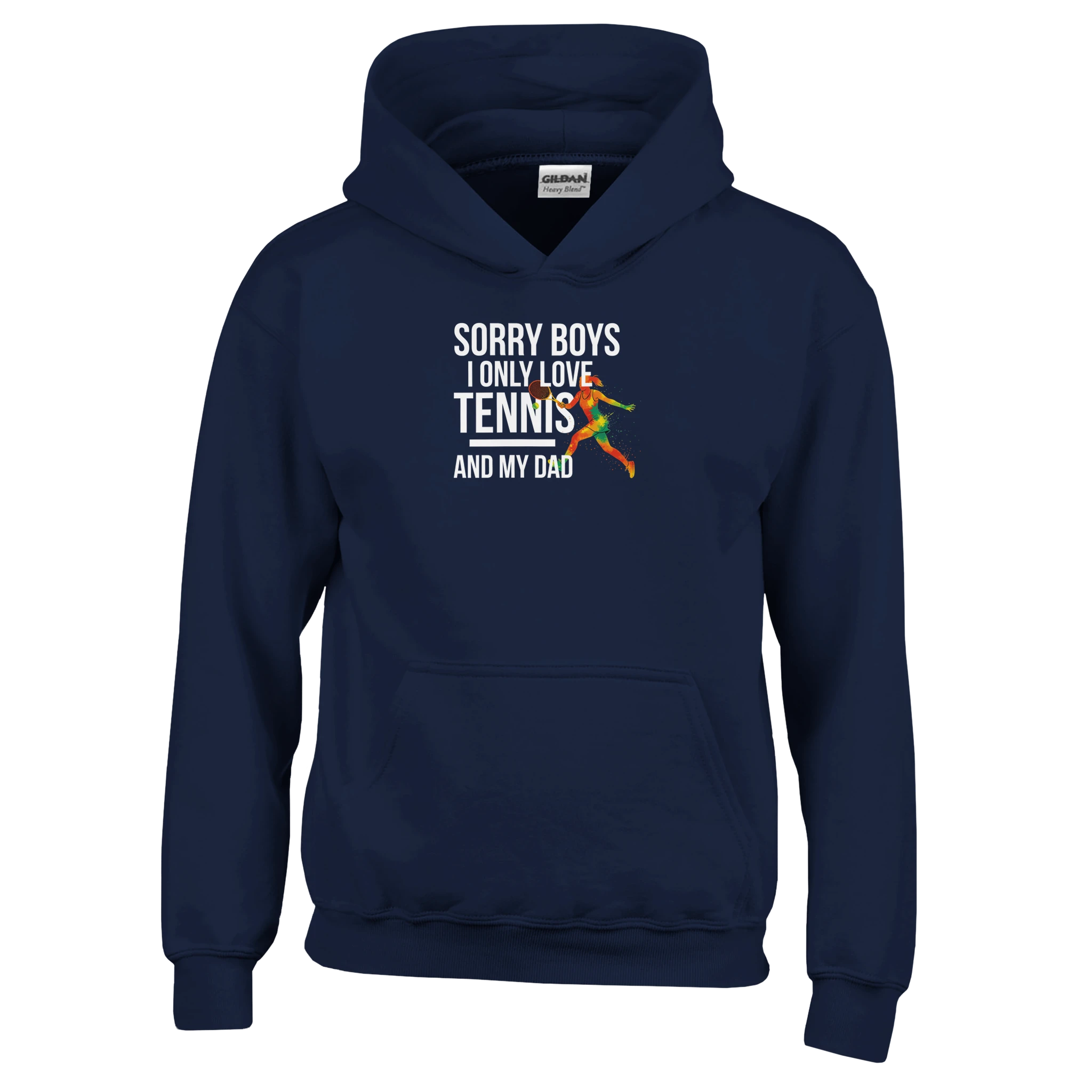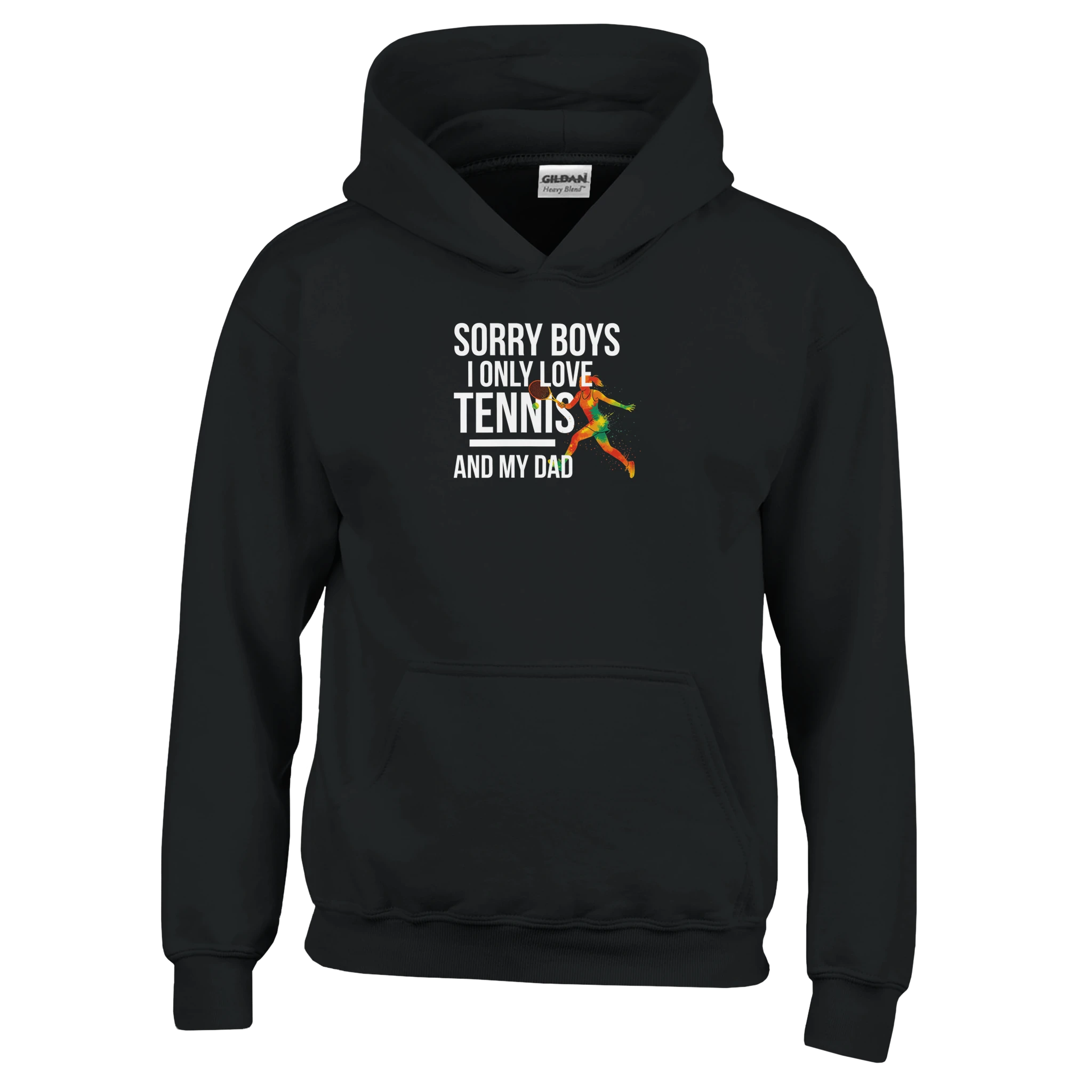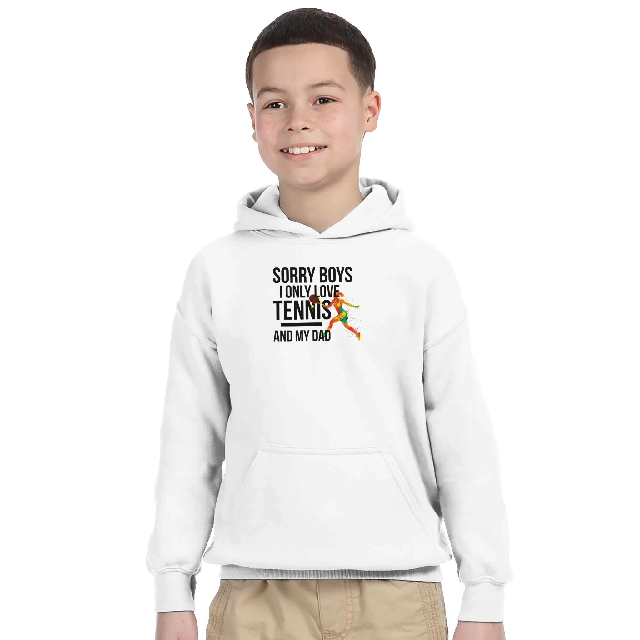 Sweat à capuche enfant sport personnalisé « Sorry Boys I Only Love Tennis And My Dad« . Gildan 18500B épais, mélange coton/polyester doux, capuche doublée, poche ventrale.