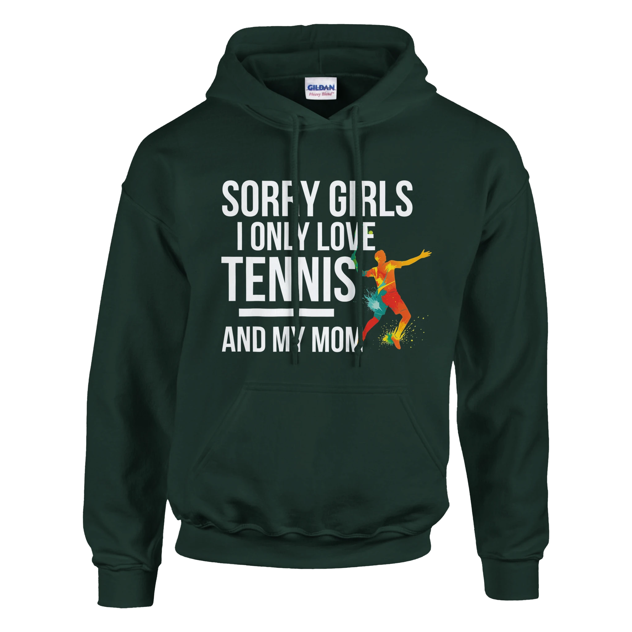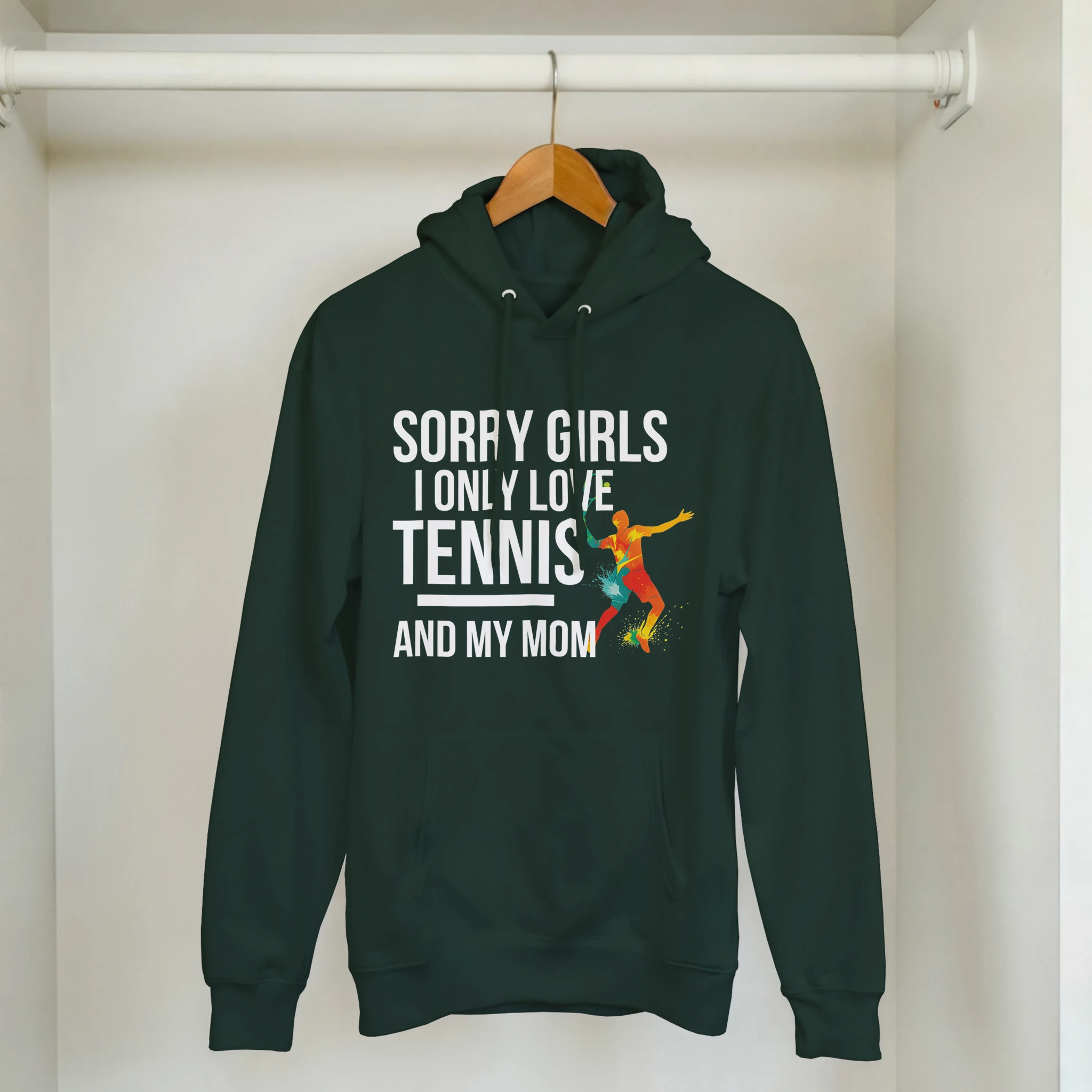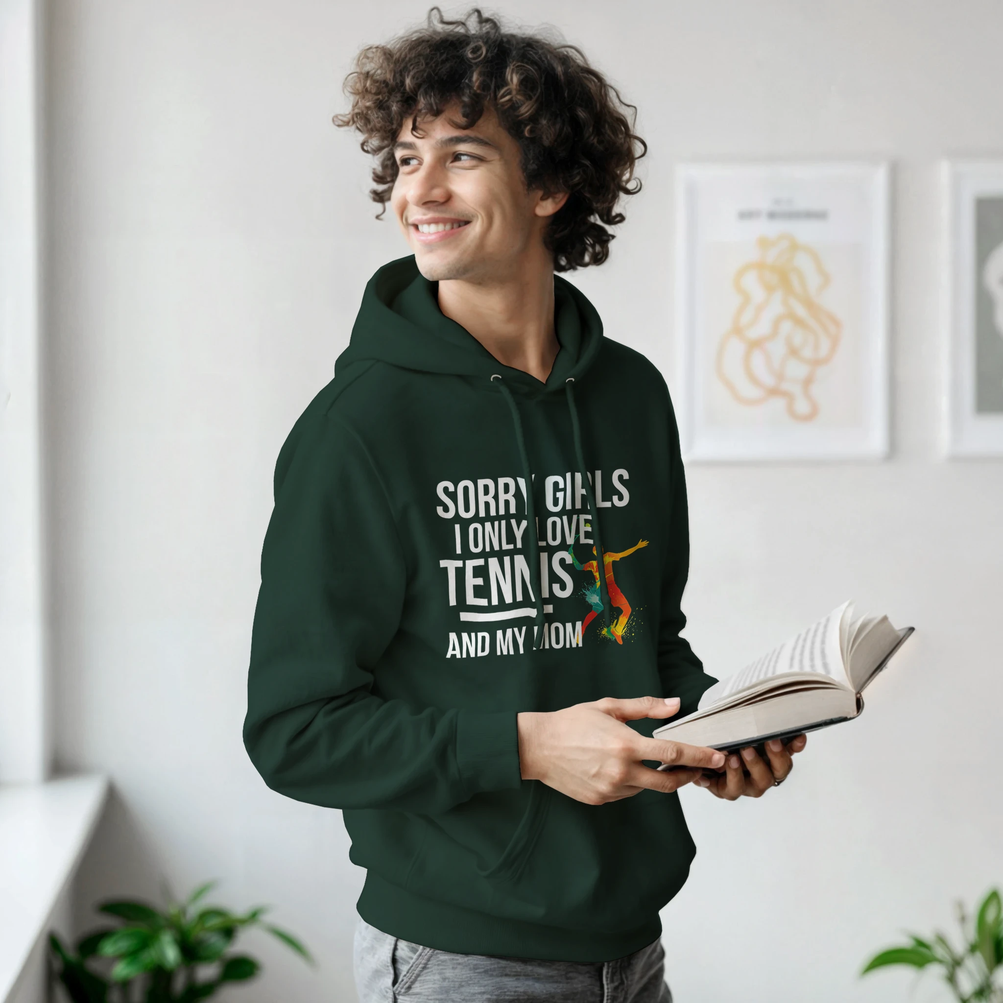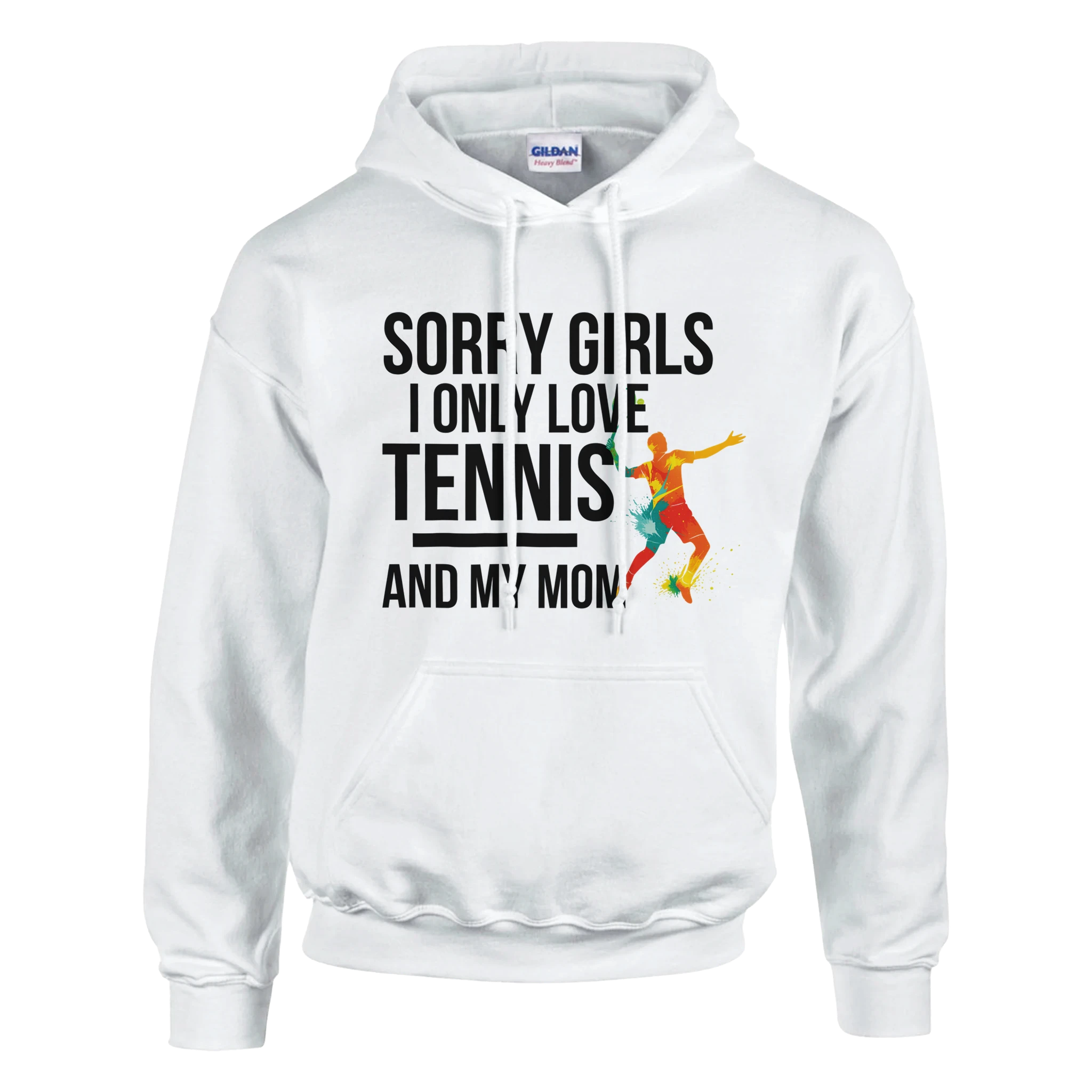 Sweat à capuche sport personnalisé « Sorry Girls I Only Love Tennis And My Mom« . Mélange coton/polyester épais, capuche doublée avec cordon, poche ventrale, confort optimal.