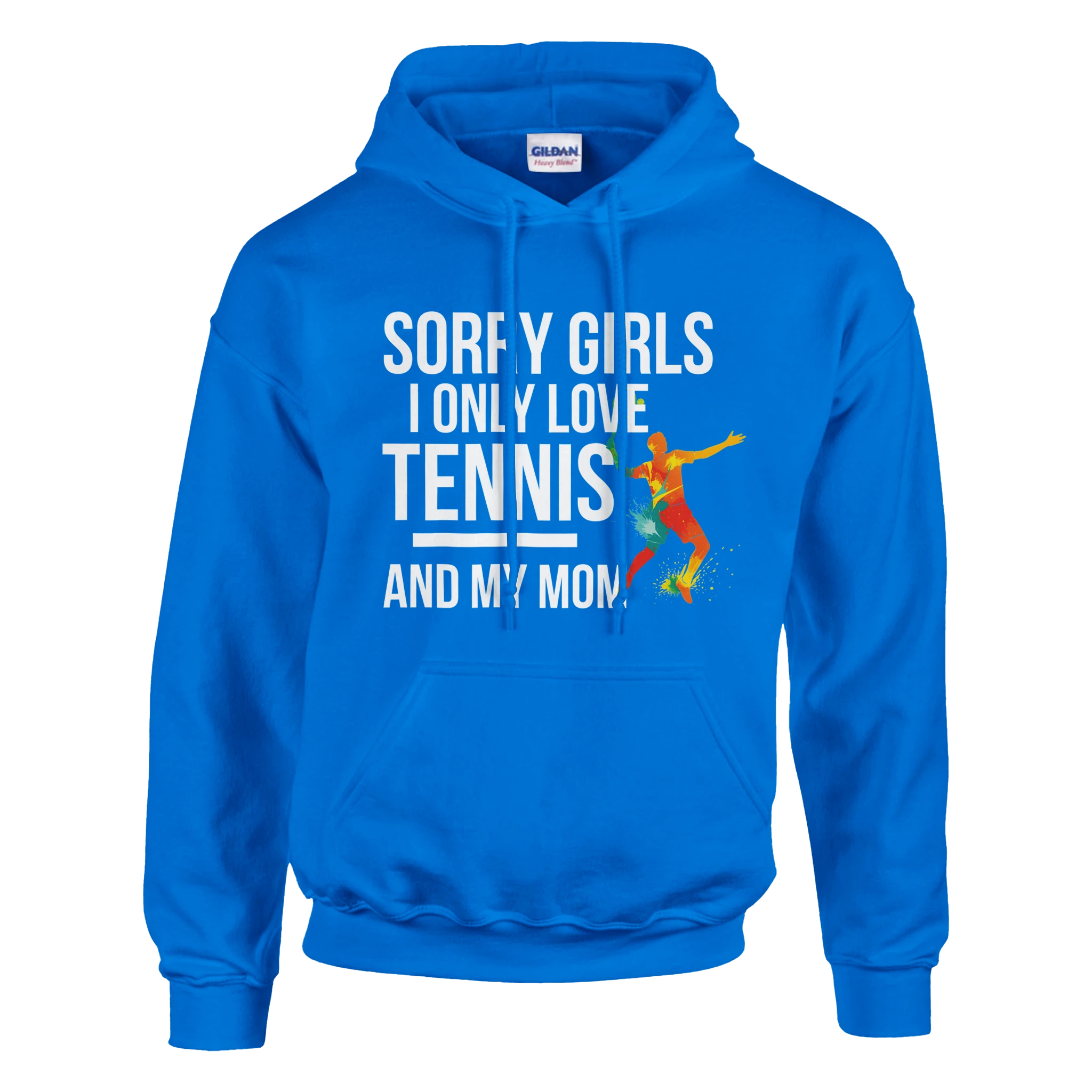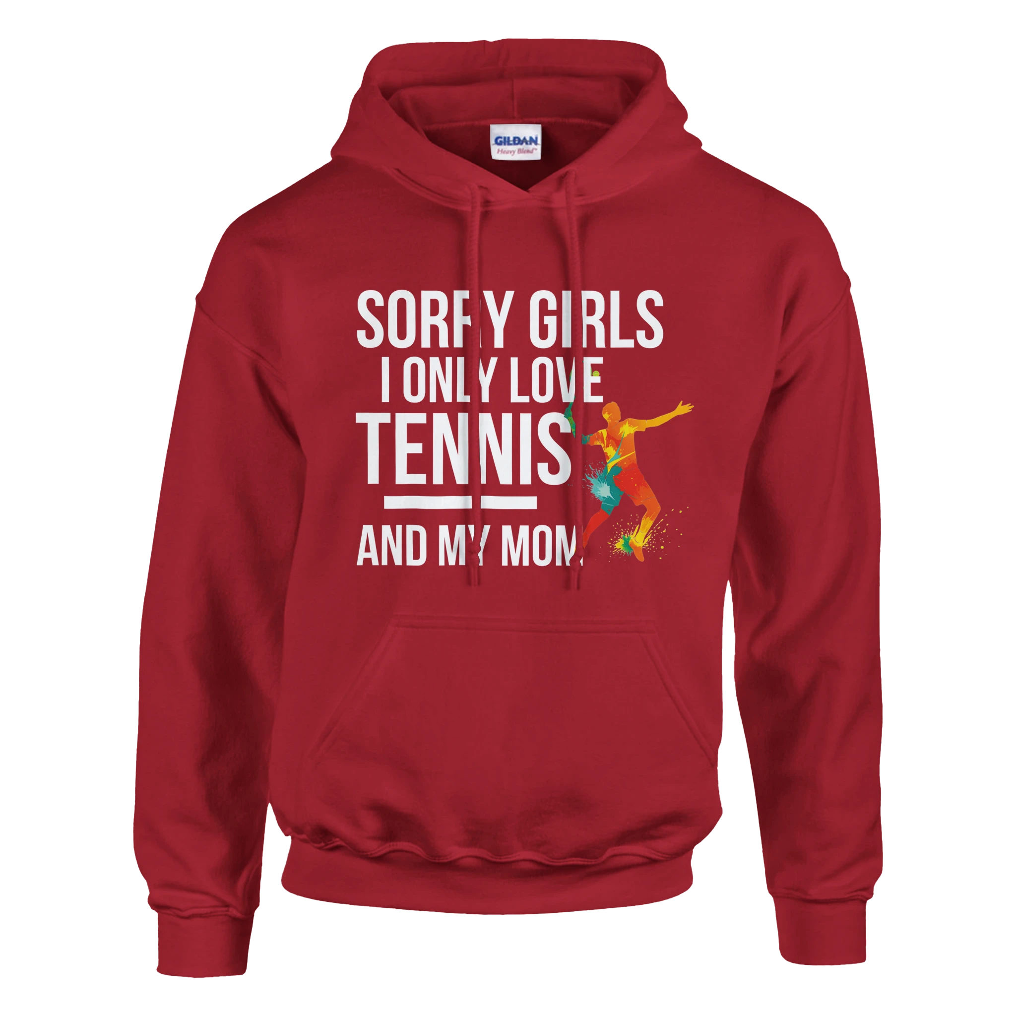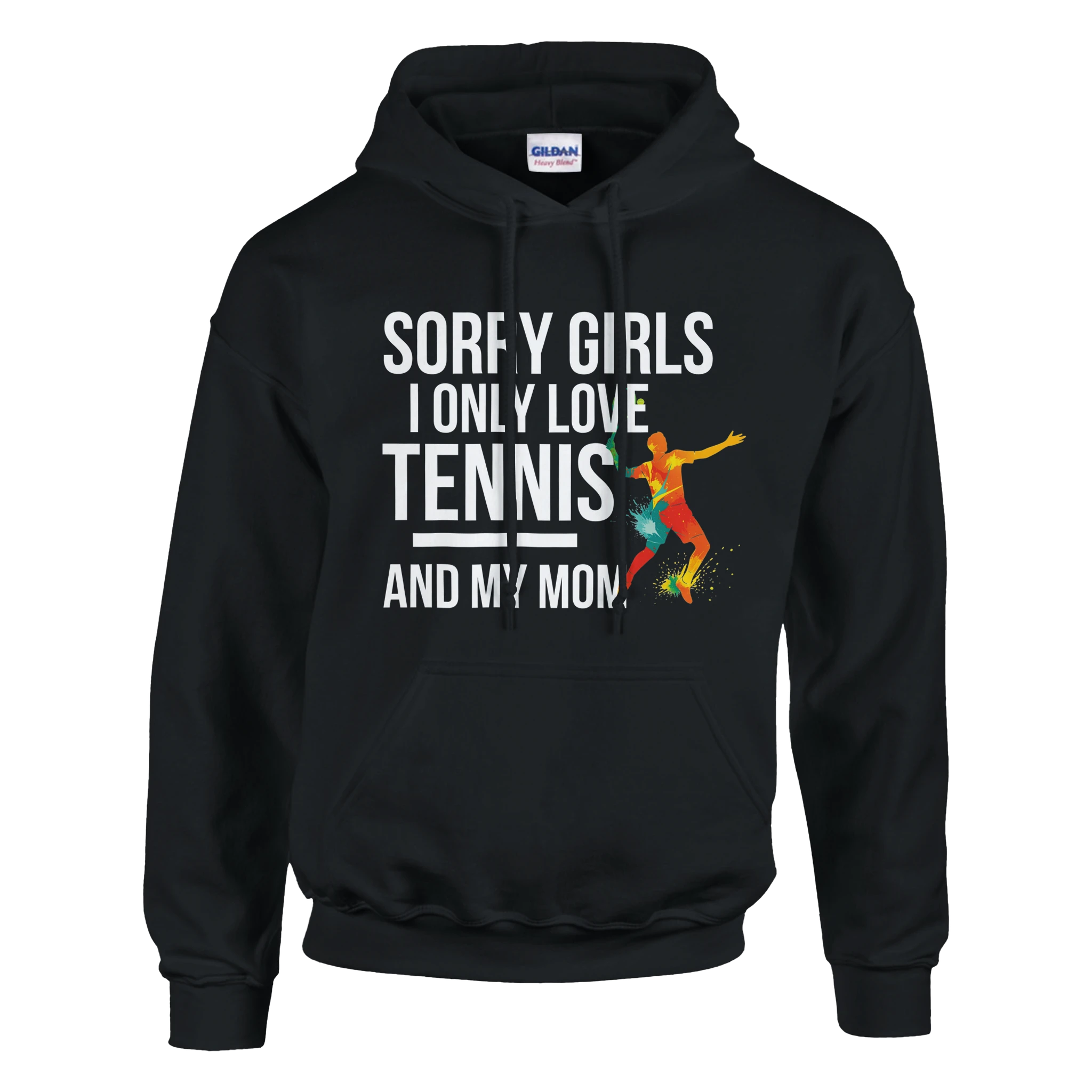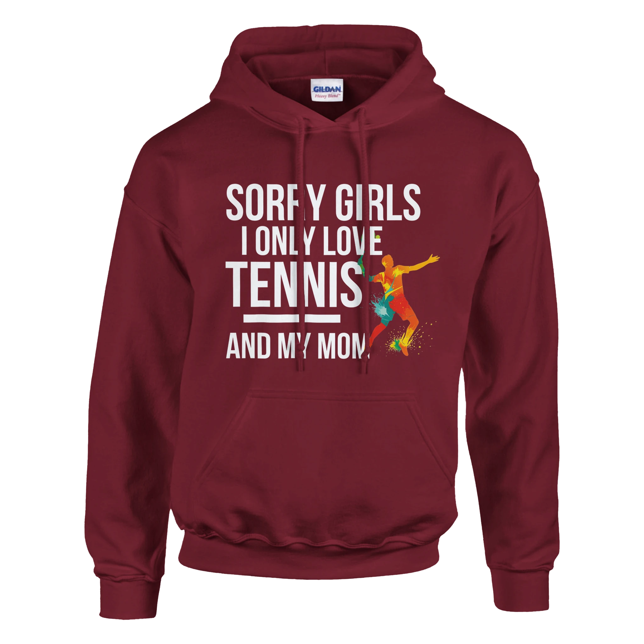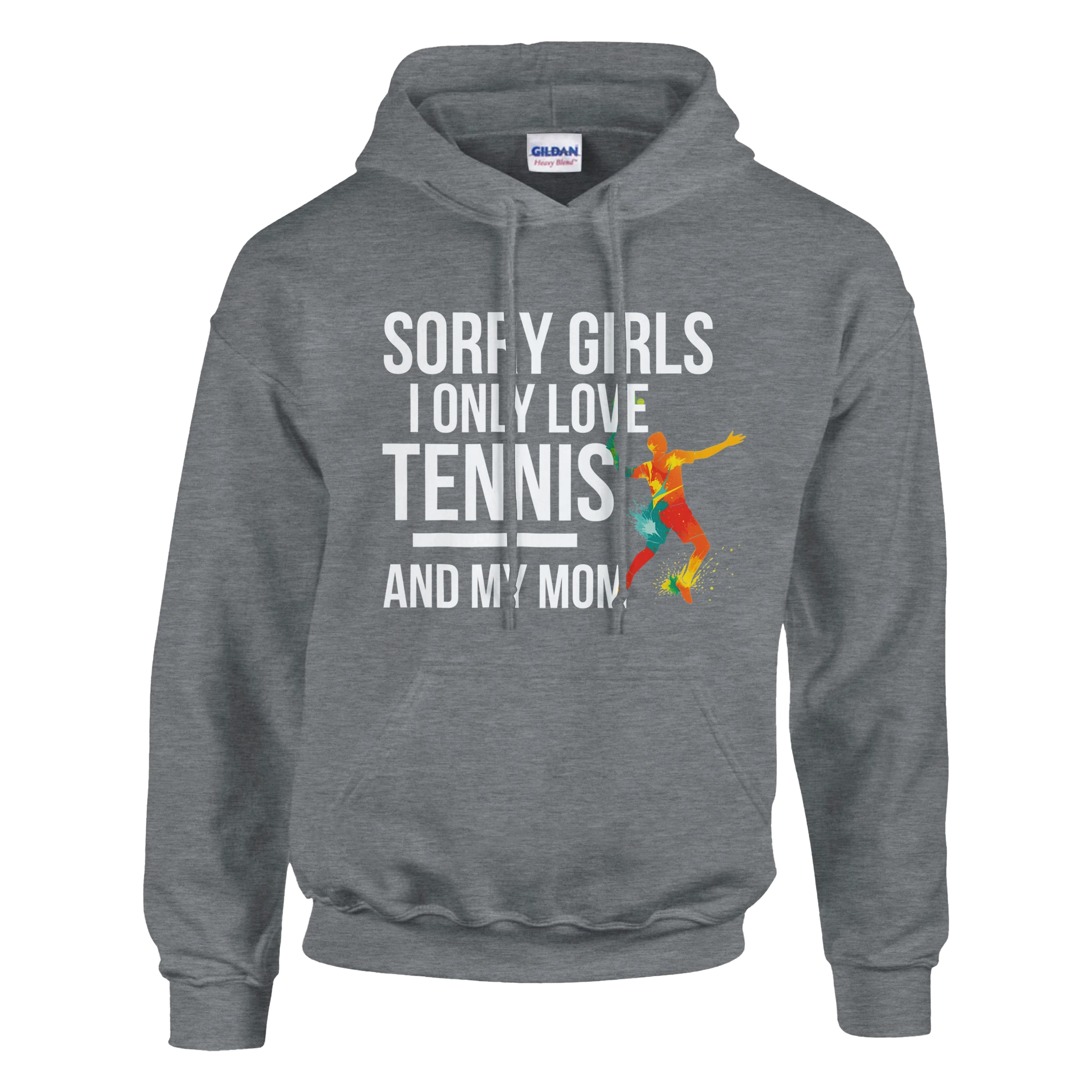 Sweat à capuche sport personnalisé « Sorry Girls I Only Love Tennis And My Mom« . Mélange coton/polyester épais, capuche doublée avec cordon, poche ventrale, confort optimal.